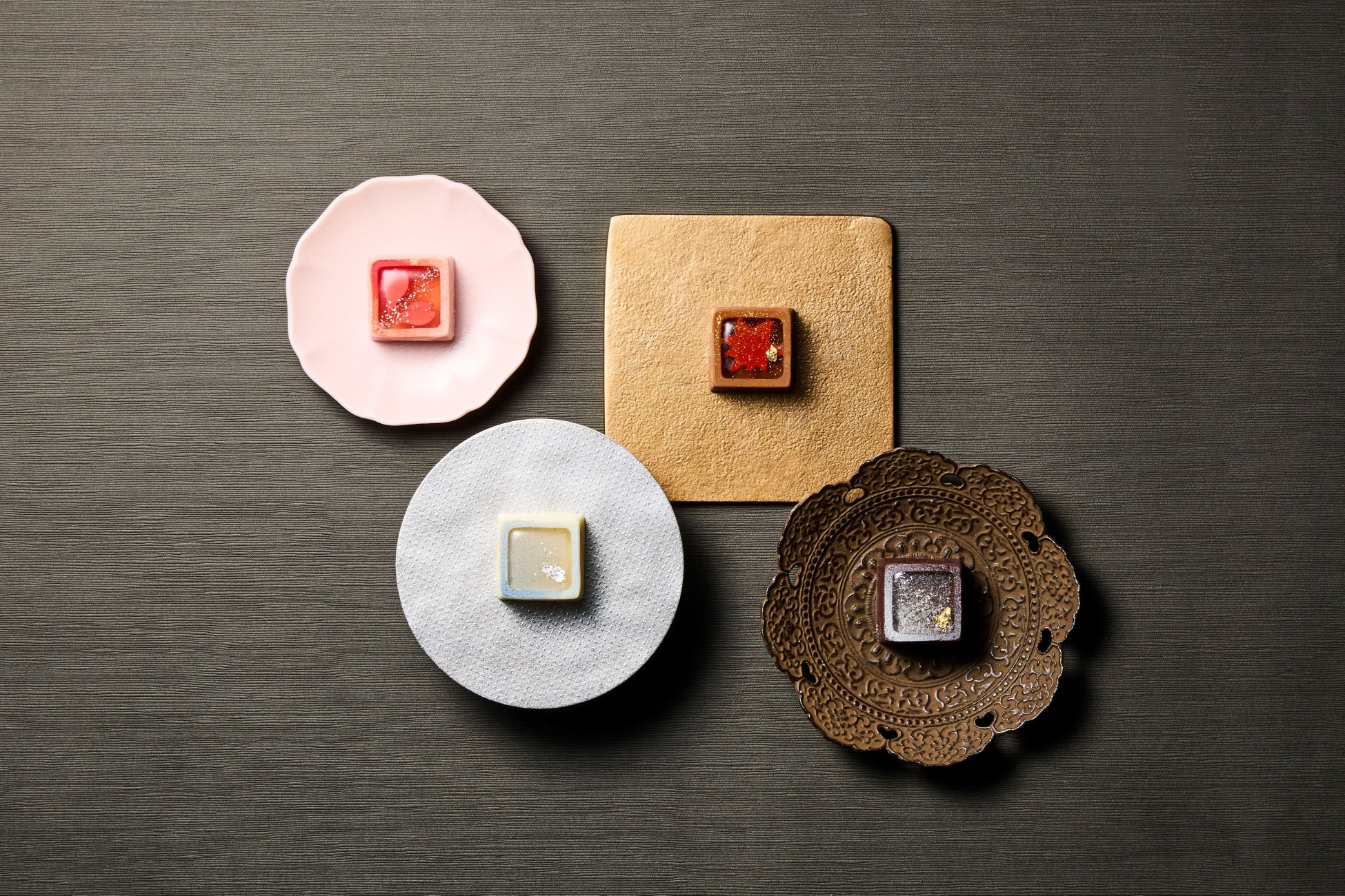 春の桜や苺、夏の爽やかなグレープフルーツと京都府産蜂蜜「京百花」、秋の香り高いほうじ茶、冬の水尾柚子の酸味と香りなど、四季折々の素材を繊細なジュレとショコラで丁寧に表現しました。