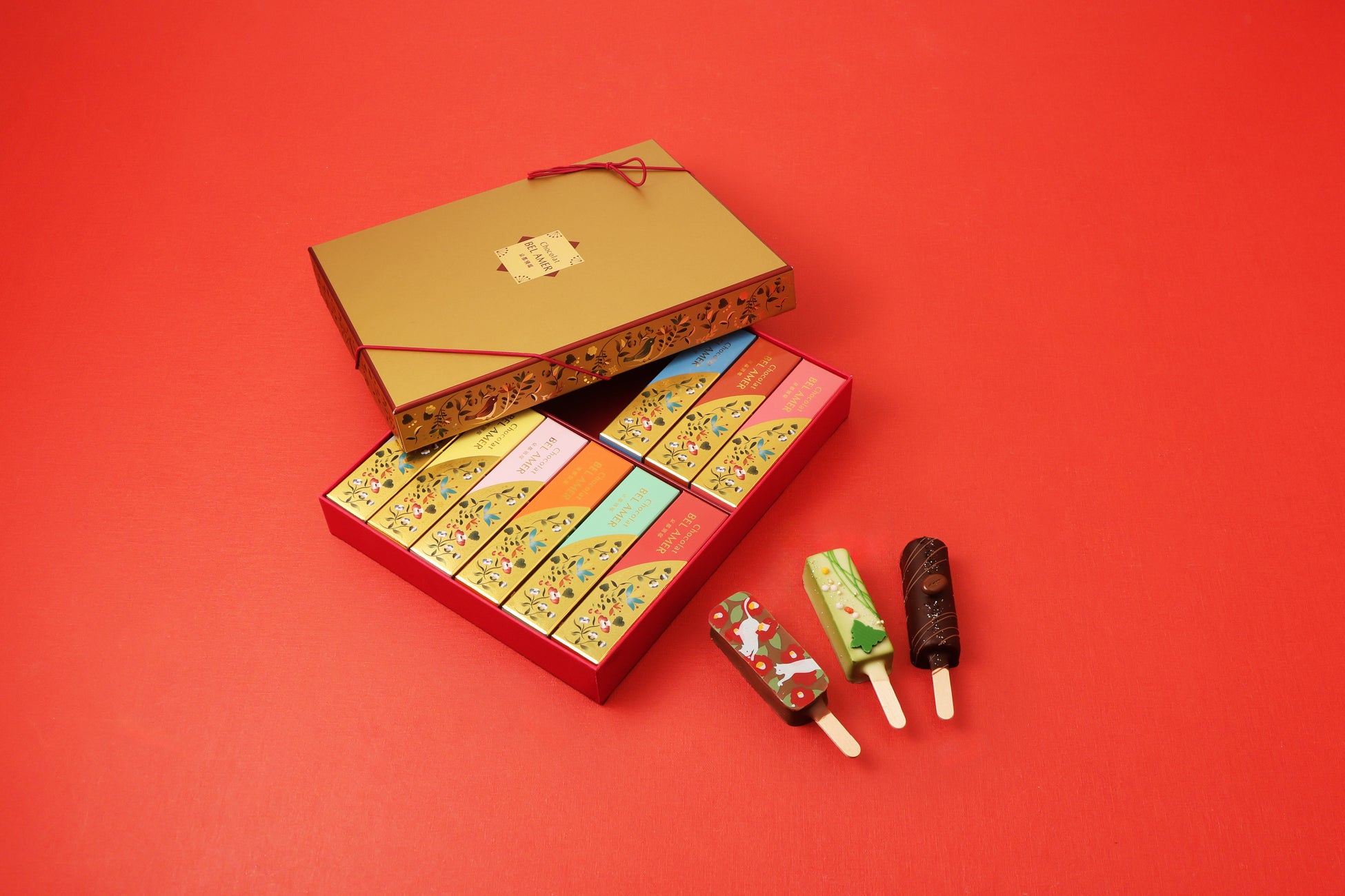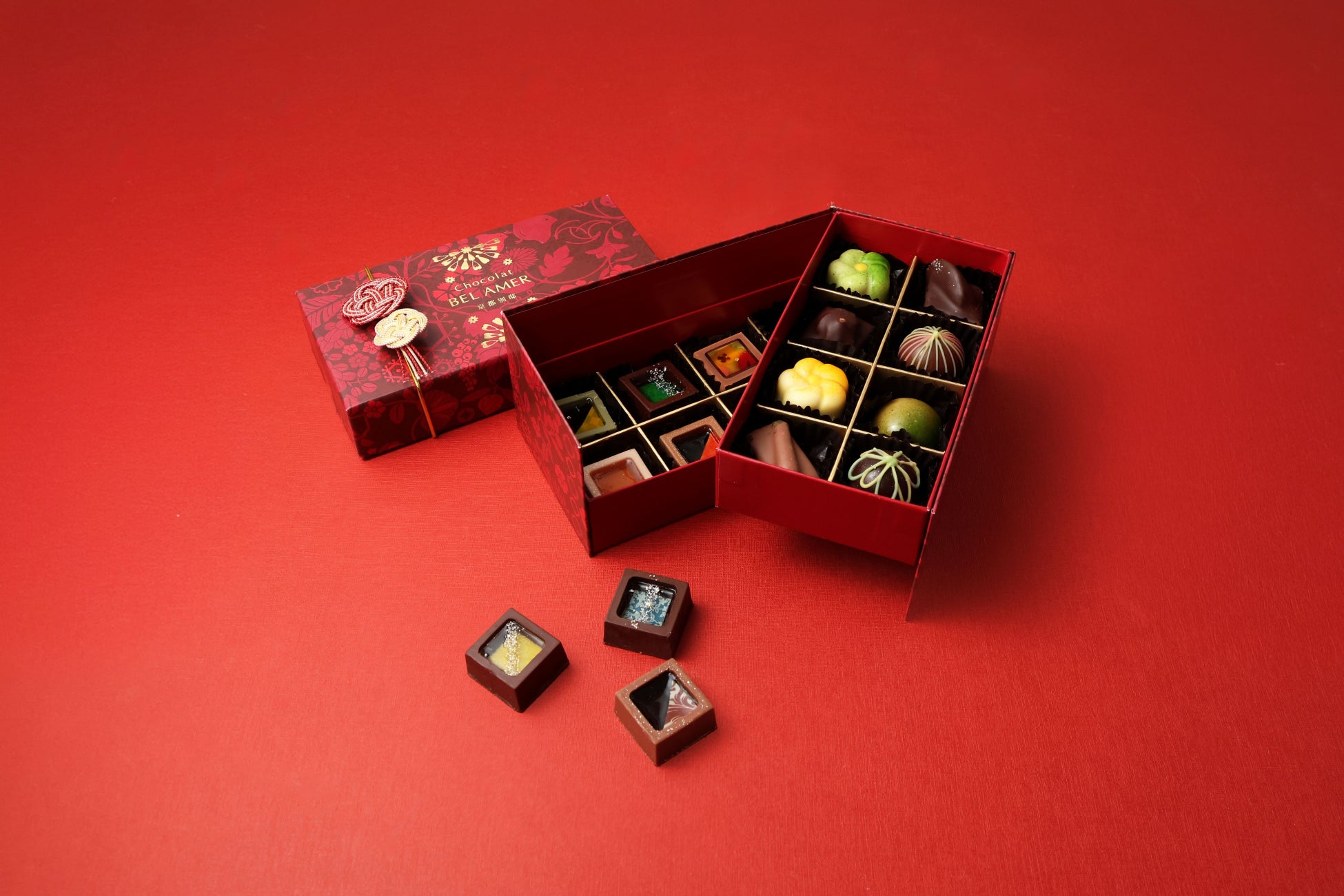 枡に見立てたショコラの中に、厳選した日本の素材をジュレにして閉じ込めた、ベルアメール京都別邸の新作コレクション。瑞々しいジュレとショコラが織りなす、繊細で上品なマリアージュをお楽しみいただけます。京都で栽培された酒米「祝」を使用した日本酒のチョコレート、国産フルーツと蜂蜜を組み合わせたフルーティーな一粒、全国からセレクトしたお茶の香りを閉じ込めたショコラなど、日本各地の素材の魅力がひと箱に詰まっています。和の素材とショコラの出会いが生み出す、やさしく奥深い味わいと香りの余韻を、ひと粒ごとにお楽しみください。