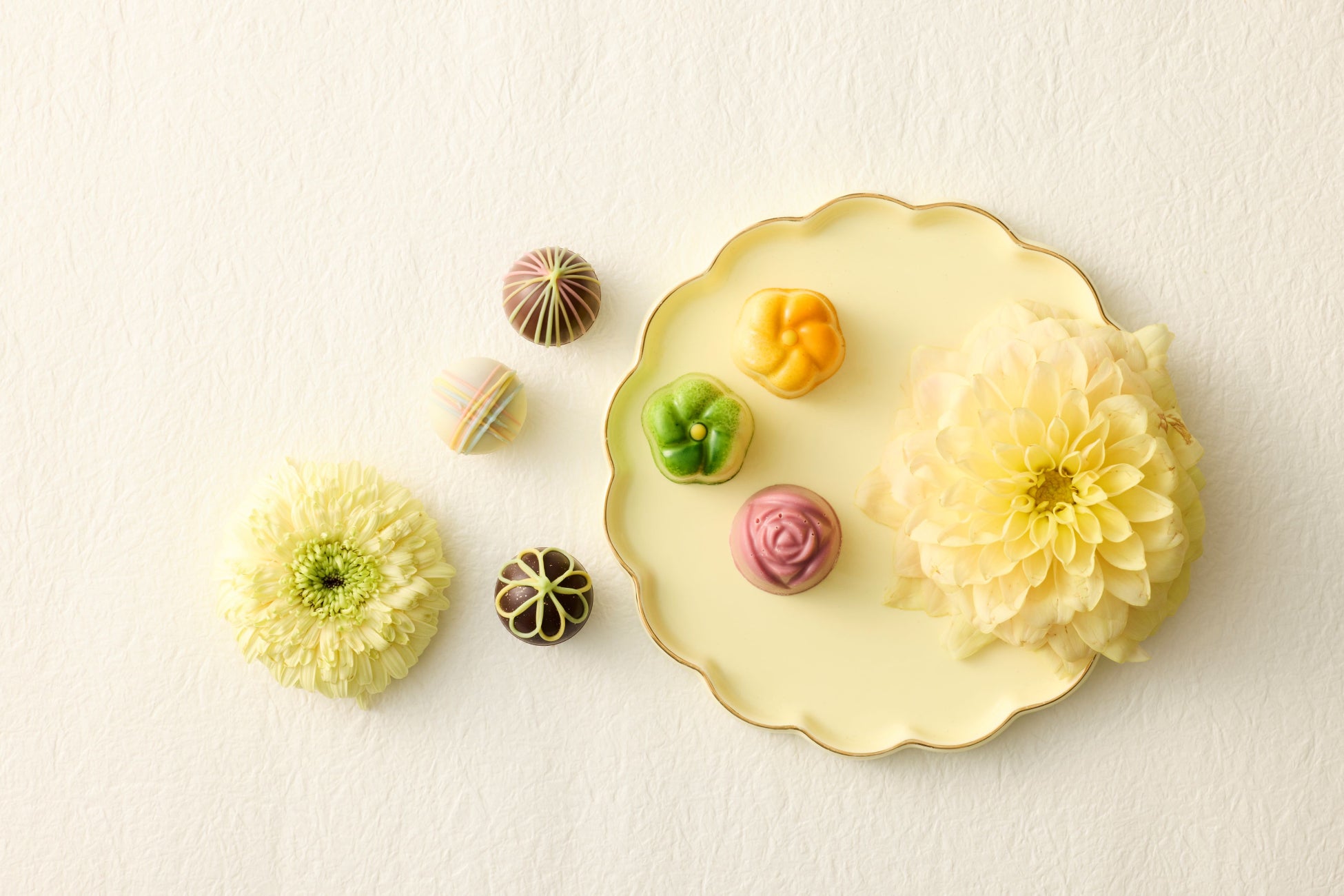 花や鞠をモチーフに、キャラメルやプラリネを重ねて和菓子のような繊細な造形美を表現した、ベルアメール京都別邸の人気のショコラ。
