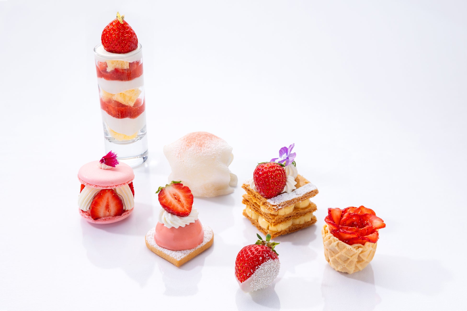 やさしい甘さの餡と苺を合わせた苺大福や、層の食感を楽しめる苺のミルフィーユ、苺の酸味とチョコレートのコクを組み合わせた苺チョコレートなど、素材の持ち味を活かした定番の味わいを揃えています。苺のマカロンや苺のショートケーキ、苺のバスケットは、焼き菓子ならではの香ばしさやクリームのなめらかさが特徴です。