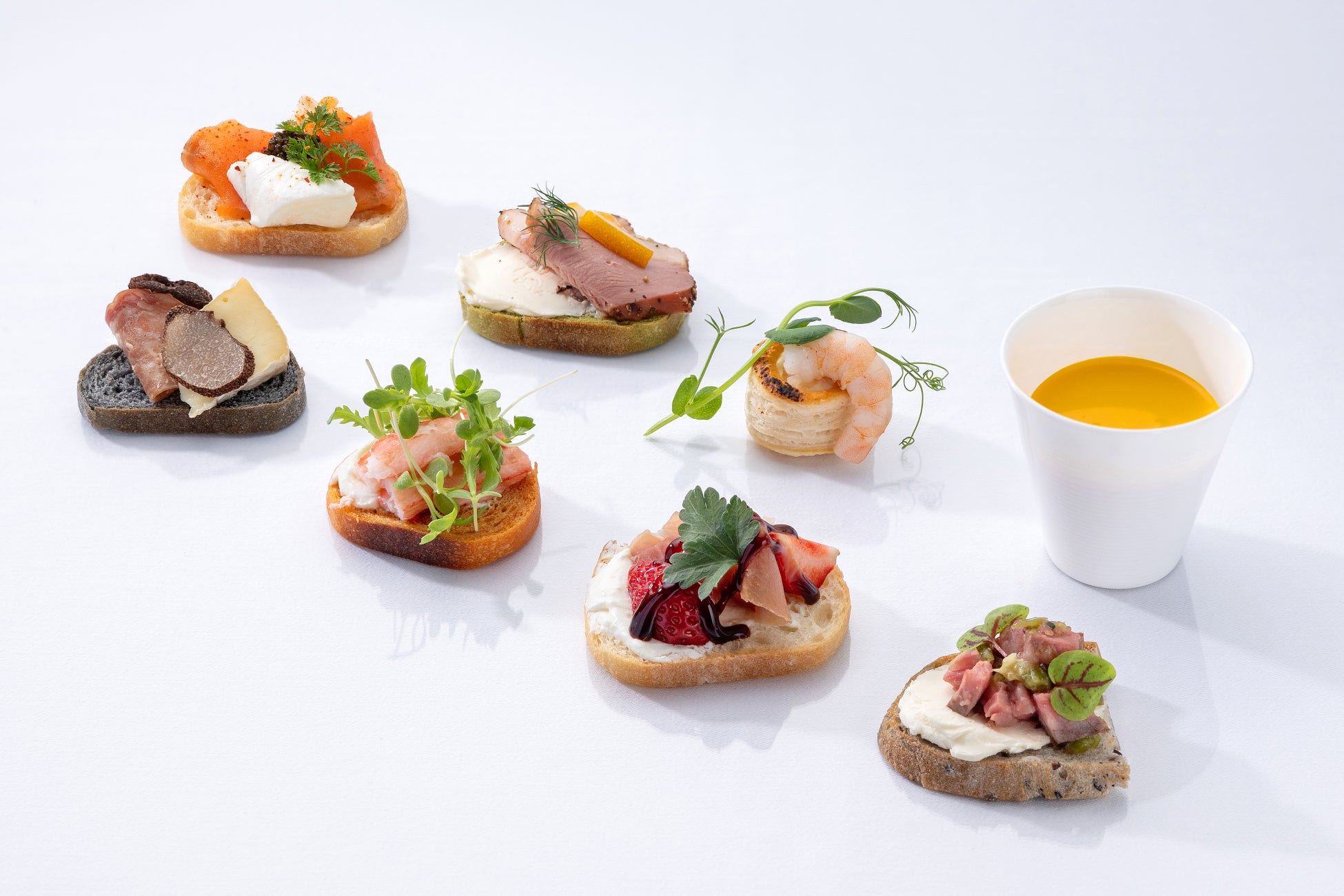 本アフタヌーンティーでは、チーズを軸に、肉・魚介・野菜それぞれの素材の個性を引き出したセイボリーを中心に構成しています。各タルティーヌは、使用するチーズや素材の組み合わせにより、異なる味わいを楽しめる内容となっています。