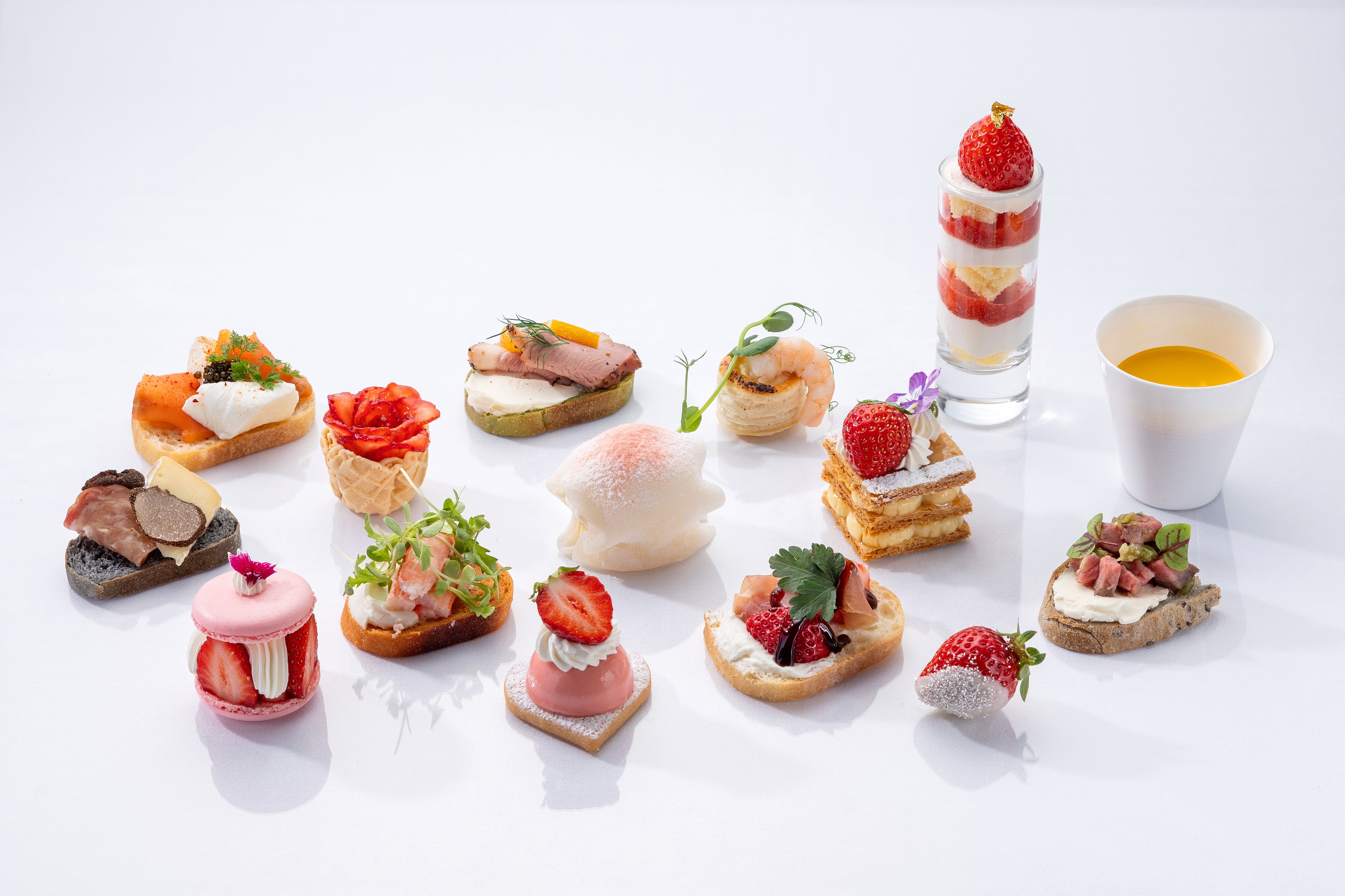 セイボリーの余韻を受け止めるミニャルディーズは、旬の苺を主役に、食感や甘味の強弱を意識して構成しています。和と洋、軽やかさとコクを織り交ぜることで、最後まで単調にならないラインアップとしました。