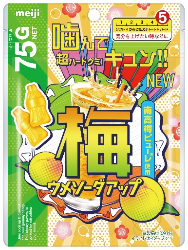「ウメソーダアップ」も、「ピーチソーダアップ」同様により多くのお客さまに「アップグミ」を手に取っていただきたいという想いから、Z世代の女性に人気※3の、ハード食感と梅フレーバーを組み合わせました。「かみごたえチャート5」のしっかりとしたハードな食感で、噛むほどに酸味の効いた爽やかな風味をお楽しみいただけます。