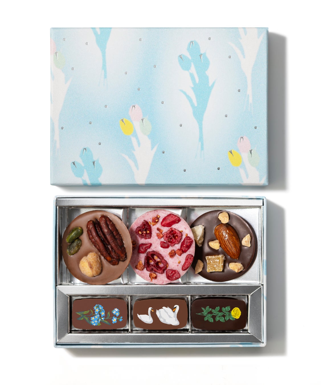 白鳥やお花をプリントした華やかなローズの香りや、ナッツの味わいのチョコレート。ナッツやベリー、レモンをトッピングした、彩り豊かなマンディアン。2種類のチョコレートを詰め合わせました。