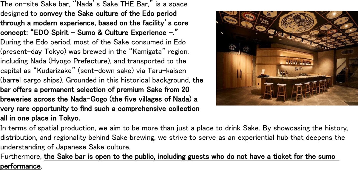併設する日本酒バー「灘の酒 THE Bar」は、施設コンセプトである「EDO Spirit – Sumo & Culture Experience -」に基づき、江戸時代の酒文化を、現代の体験を通じて伝える空間です。
