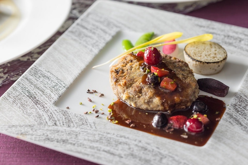 肉料理には、肉々しい旨み豊かなハンバーグステーキとショコラのソースを合わせた「ハンバーグステーキ ショコラとフランボワーズ香るデミグラスソース」。濃厚なデミグラスにショコラのコクとフランボワーズ(ラズベリー)の酸味を重ね、奥深い味わいと華やかな余韻を楽しめる一品です。