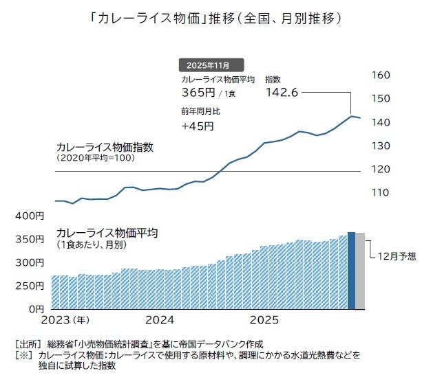 2025年11月のカレーライス物価平均は1食365円(前年同月320円)となった。