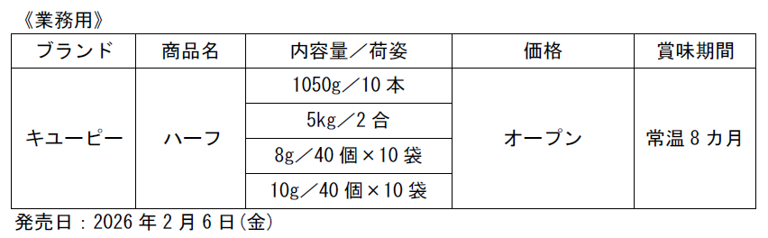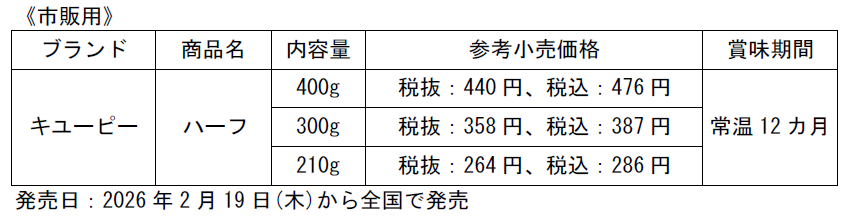 キユーピー株式会社(本社:東京都渋谷区、代表取締役 社長執行役員:髙宮 満、以下キユーピー)は、キユーピー マヨネーズに比べてカロリーが50%カットの「キユーピーハーフ」の大幅リニューアルを行い、市販用は2026年2月19日(木)、業務用は同年2月6日(金)から全国で発売します。市販用と業務用のいずれも、キユーピー マヨネーズと同様の「卵黄タイプ」に変更し、“卵黄ならではのコクとうま味”を実現しました。