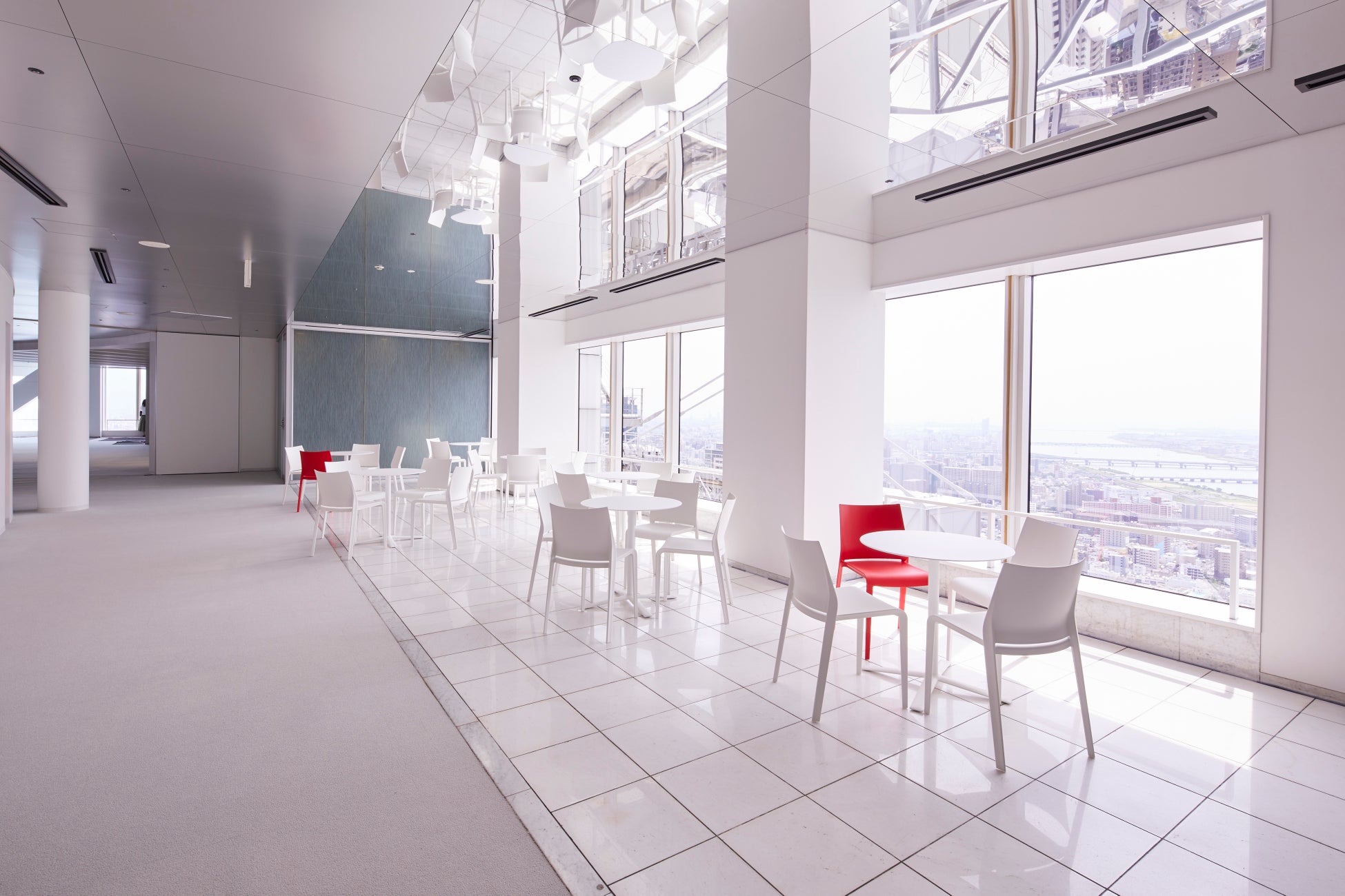 昼は青空と街並み、夜は煌めく夜景を眺めながら、ドリンクやスイーツを楽しめる非日常空間。