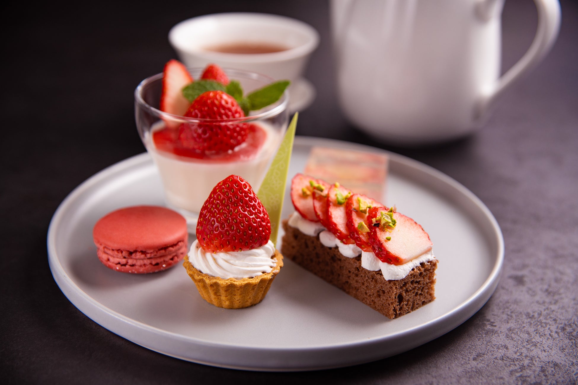 内容:いちごの杏仁豆腐、いちごのタルト、いちごのマカロン、いちごのテリーヌ、イチゴのショコラ馬拉糕