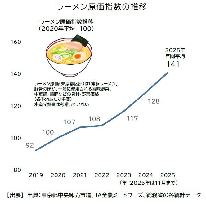 ラーメン店では、小麦や野菜、油脂類など原材料価格の高止まりが続き、コスト面でも厳しい経営環境は変わらない。ラーメンで使用する原材料のトータルコスト推移を示す「ラーメン原価指数(豚骨ベース、東京都区部)」をみると、2020年平均を100とした場合における2025年の原価指数は141となった。