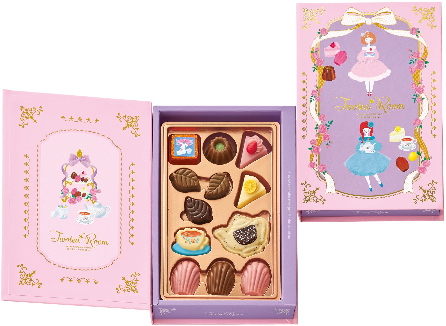 見た目にも可愛いスイーツ型のミニチュアチョコレートと、紅茶フレーバーを使用したチョコレートの詰め合わせです。アフタヌーンティーを嗜む二人の女の子をデザインコンセプトに、バラやリボンなど華やかな世界観に仕上げたデザイン。「ヌン活」を楽しむ現代女子にぴったりの、心ときめく新ブランドです。