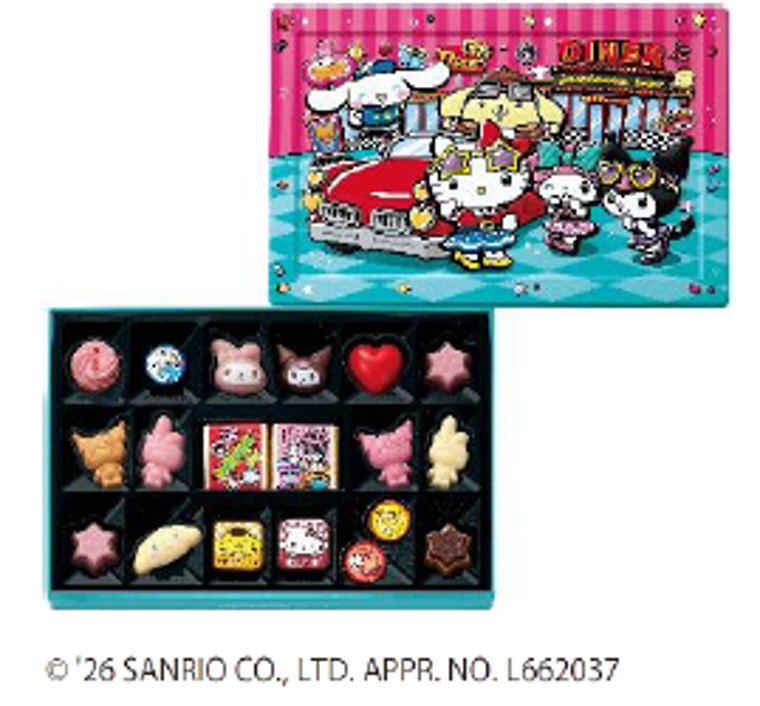 人気のレトロテイスト「アメリカンダイナー」をテーマに、クロミやマイメロディ、ハローキティ、シナモロール、ポムポムプリンなどサンリオの人気キャラクターが勢ぞろい。オリジナル描き下ろしデザインの立体缶や、パッケージ、チョコレートにキャラクターが満載の、賑やかなチョコレートブランドです。