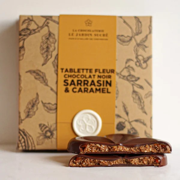 ル・ジャルダン・シュクレの象徴的なロゴをモチーフとしたそば粉と塩バターキャラメルのプラリネチョコレート。カリッとしたダークチョコレート、とろけるキャラメル、そばの軽やかなサクサク感。