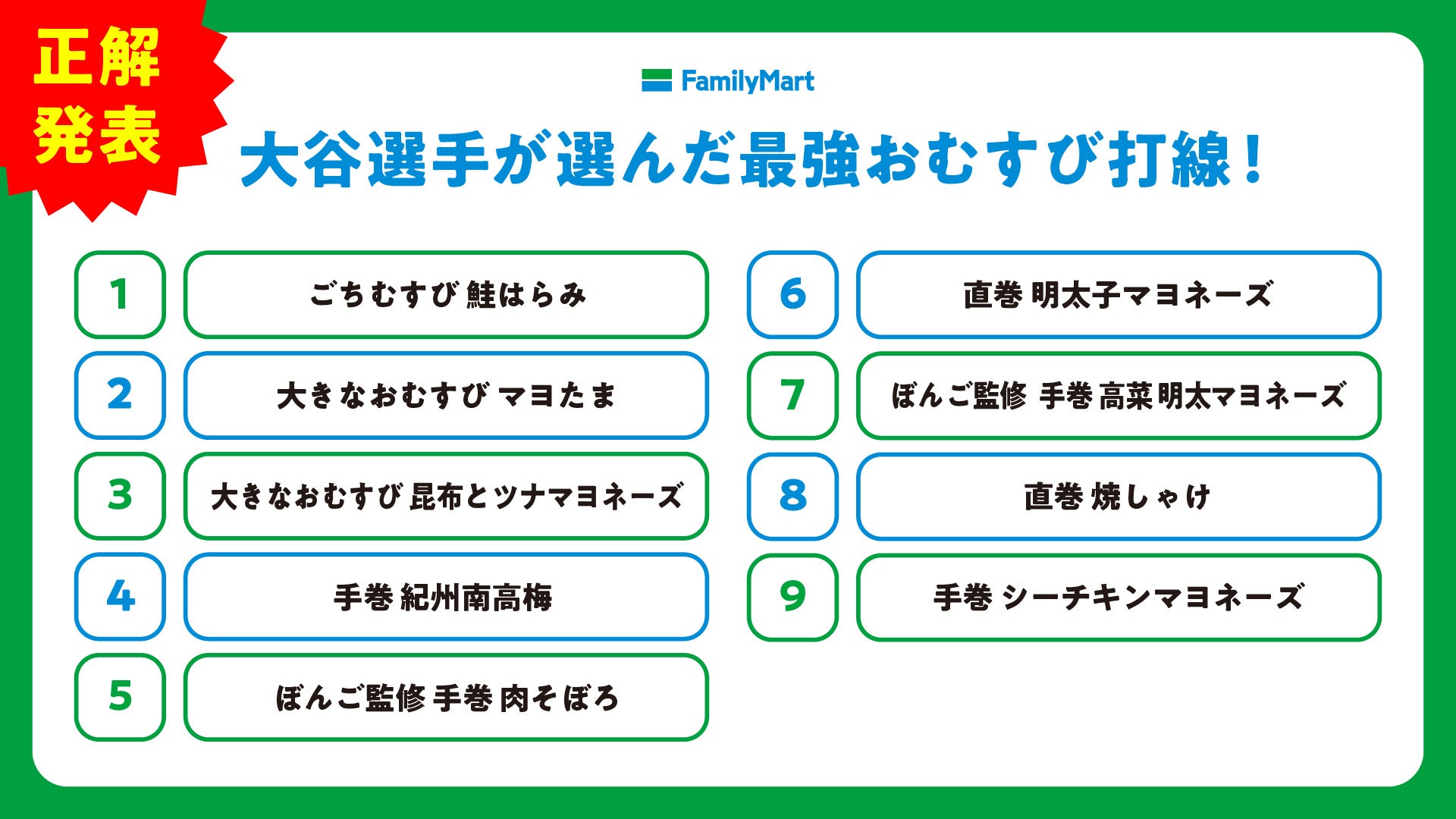 ファミリーマートのおむすび9種類を大谷選手にご試食いただき、野球の打線に例え、“おむすび打線“を考えていただきました。