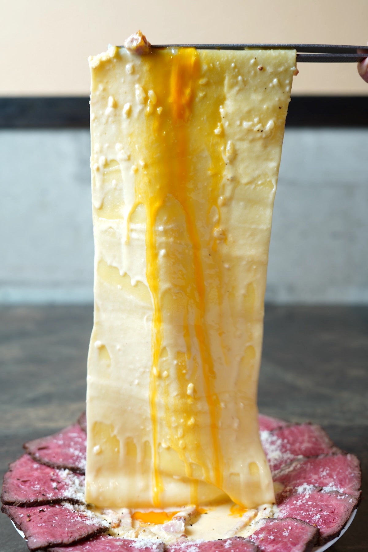 専用トングでゆっくりと引き上げると、艶やかな特製カルボナーラソースが滴り落ち、立ち上る芳醇な香りとともに、思わずシャッターを切りたくなる瞬間を演出します。