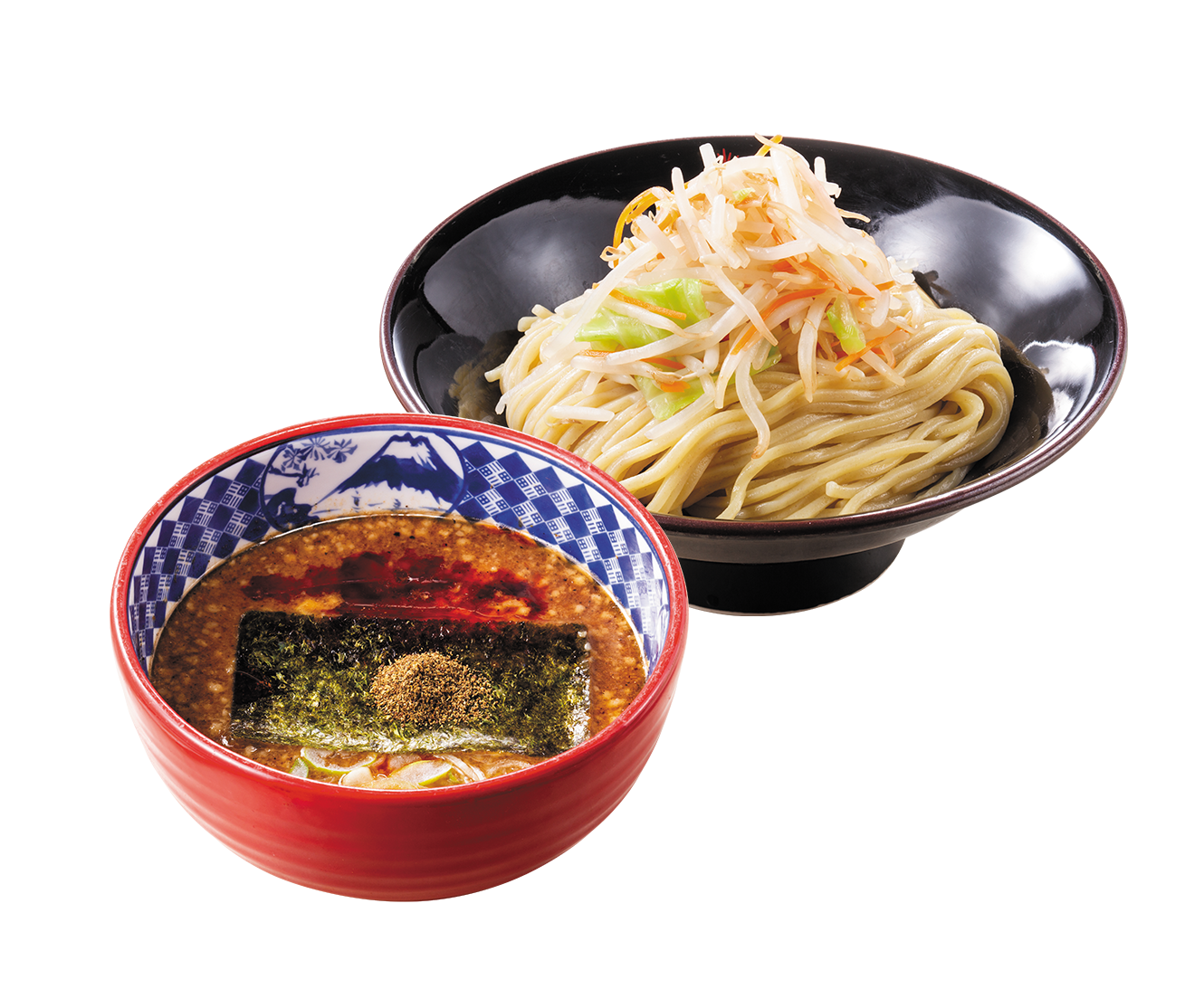 つけ麺は、たっぷりの野菜に、別添えのおろしニンニク・ショウガをアクセントとして加えることで、三田製麺所自慢のつるっとコシのある麺にしっかりと絡む仕立てにしています。
