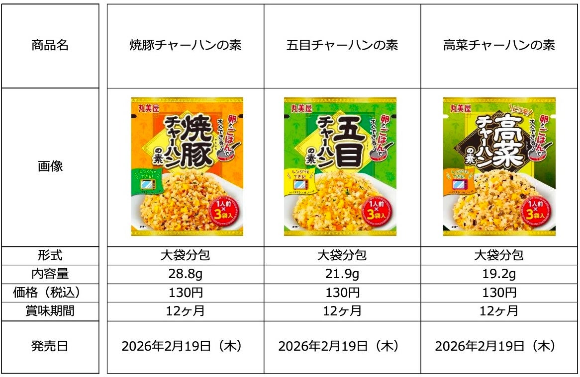 丸美屋食品工業株式会社(本社:東京都杉並区、社長:阿部豊太郎)は、「焼豚チャーハンの素」「五目チャーハンの素」「高菜チャーハンの素」を2026年2月19日(木)より新発売いたします。