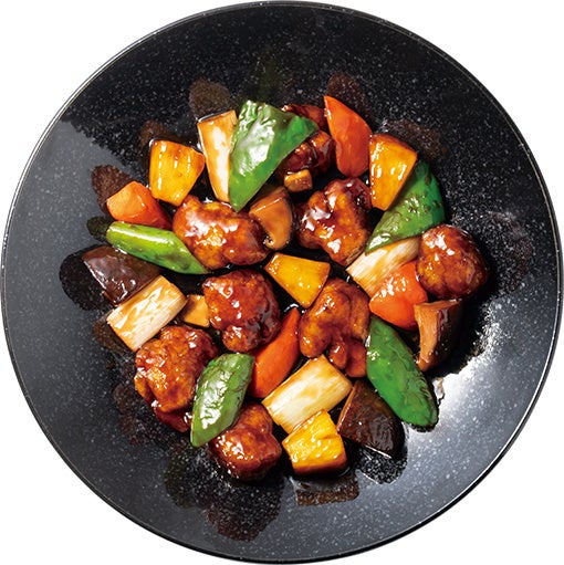 黒酢や鎮江香酢、中国醤油などをブレンドしたマイルドで奥深い味わい。ジューシーな豚肉にシイタケ、長ネギ、ピーマン、ニンジン、パイナップルと、彩りも食感も豊かな一品。