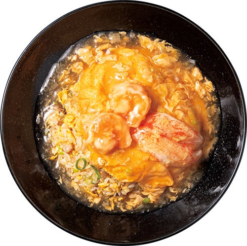餃子の王将の大人気メニュー「炒飯」に、ふんわり焼き上げた玉子をのせて、さらに玉子でとじた特製餡をかけたトリプル玉子仕立て。大ぶりな海老&カニカマがのった贅沢な一品。