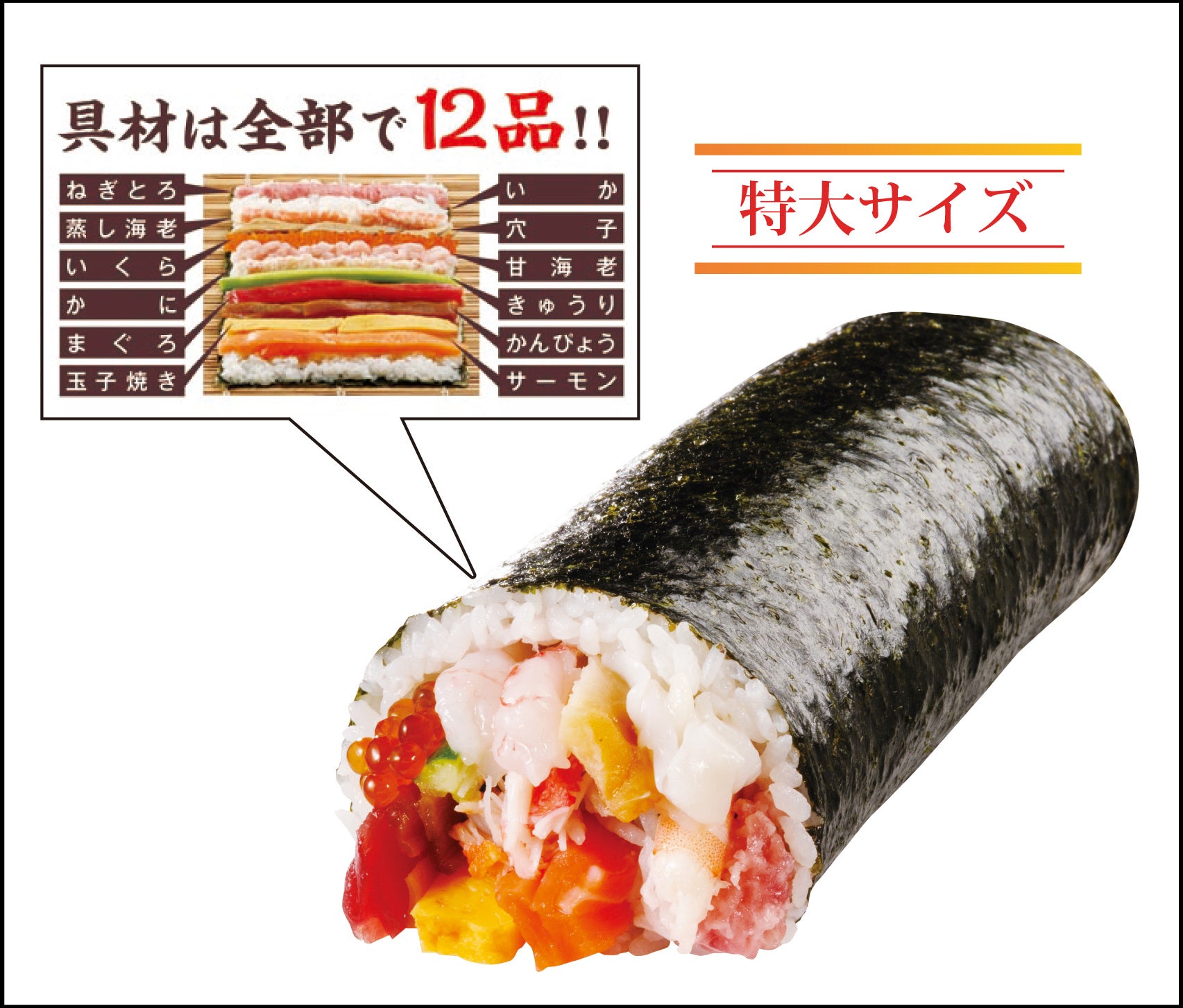 長さ約18cm・12種類の具材を巻いた圧巻の特大サイズ「①平禄開運恵方巻」。サーモン、まぐろ、いくらなど8種類の具材を巻いた「②海鮮恵方巻」。蒸し海老など6種類の具材を巻いた「③平禄恵方巻」にハーフサイズ(長さ約9cm)の「ハーフ巻」各種もご用意しております。どの「恵方巻」も1月31日(土)までのご予約で当日販売価格よりお得な価格にてご提供させていただいております。
