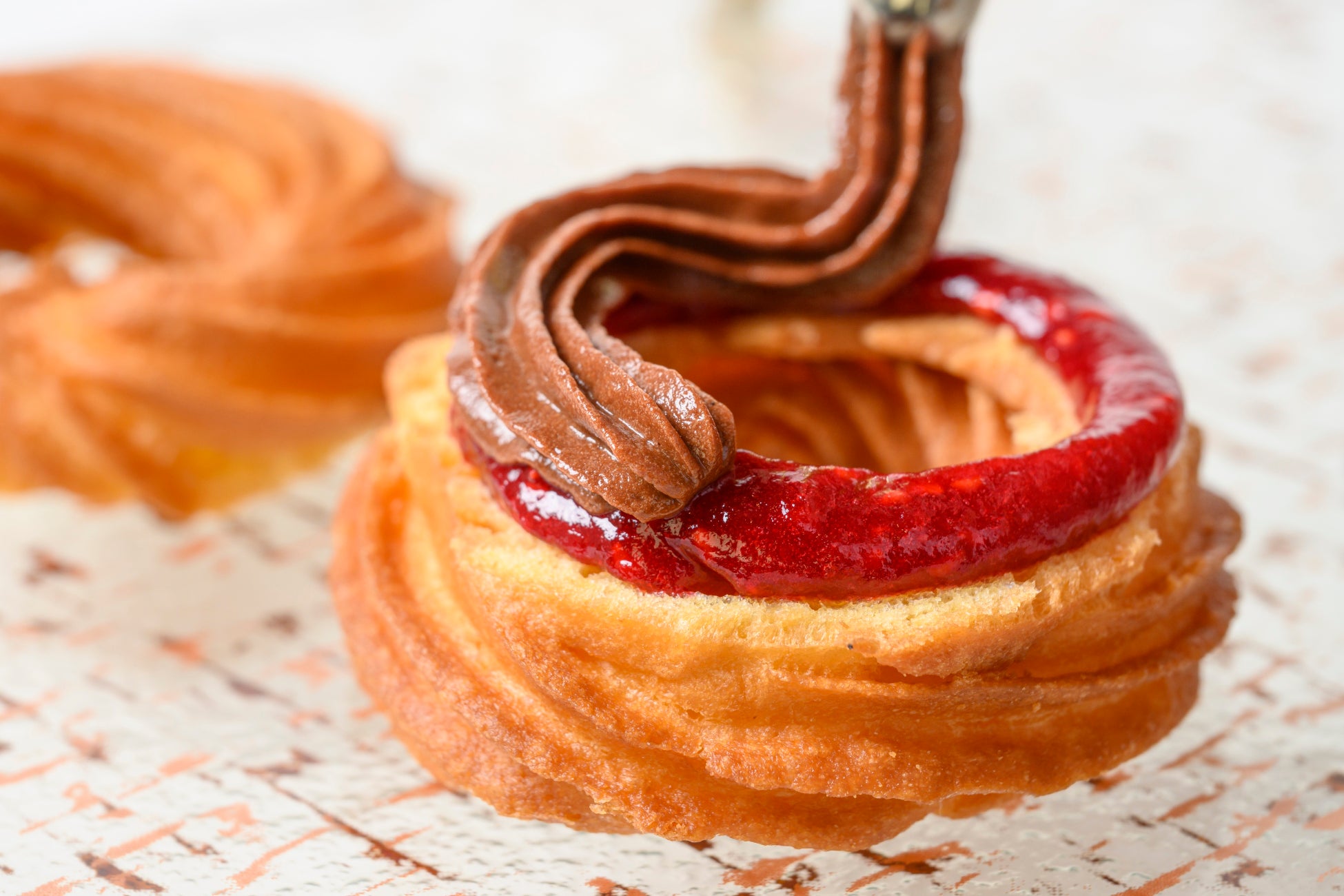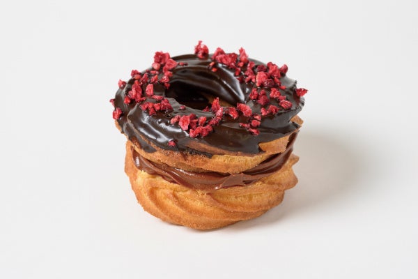 フレンチクルーラー生地にマダガスカル産カカオクリームと自家製のフランボワーズジャムが好相性。