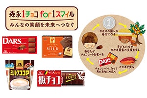 森永製菓(株)が2008年から続けているチョコレートのサステナビリティ向上を目指す活動「1チョコ for 1スマイル」。特別期間の間、対象商品1個につき1円が寄付として積み立てられ、支援対象団体であるプラン・インターナショナルとACEの2団体へ寄付が配分されます。