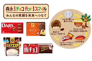 森永製菓(株)が2008年から続けているチョコレートのサステナビリティ向上を目指す活動「1チョコ for 1スマイル」。特別期間の間、対象商品1個につき1円が寄付として積み立てられ、支援対象団体であるプラン・インターナショナルとACEの2団体へ寄付が配分されます。