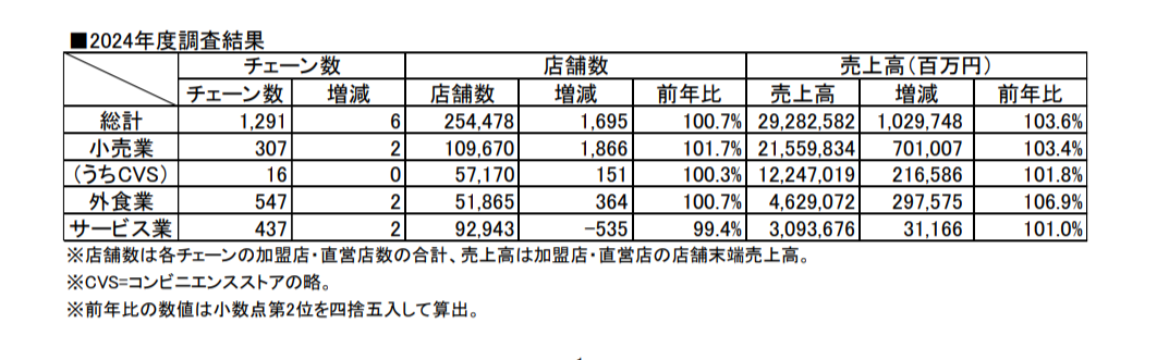 日本のFC産業は、約20年で成長期・飽和期を超えて、ここ4年程は店舗数と売上高のバランスが整い