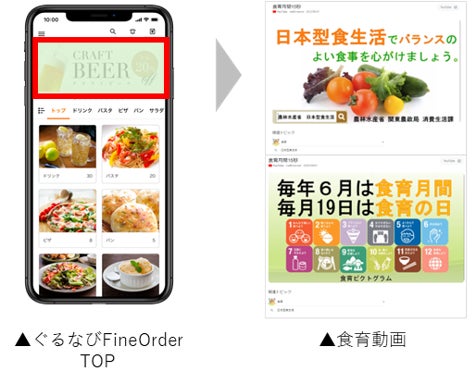 来店後、「ぐるなびFineOrder」を立ち上げたトップ画面において、栄養バランスに関するバナーを表示します。食育動画や関連サイトへ誘導し、食事の選択をより健康的でバランスの取れたものにするための「気づき」を注文前に与えることで、食事を楽しみながら自然と知識が得られる動線を作ります。