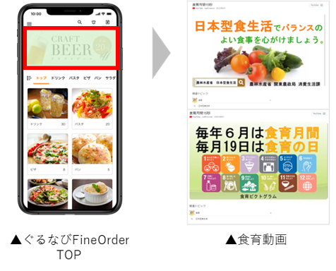 来店後、「ぐるなびFineOrder」を立ち上げたトップ画面において、栄養バランスに関するバナーを表示します。食育動画や関連サイトへ誘導し、食事の選択をより健康的でバランスの取れたものにするための「気づき」を注文前に与えることで、食事を楽しみながら自然と知識が得られる動線を作ります。
