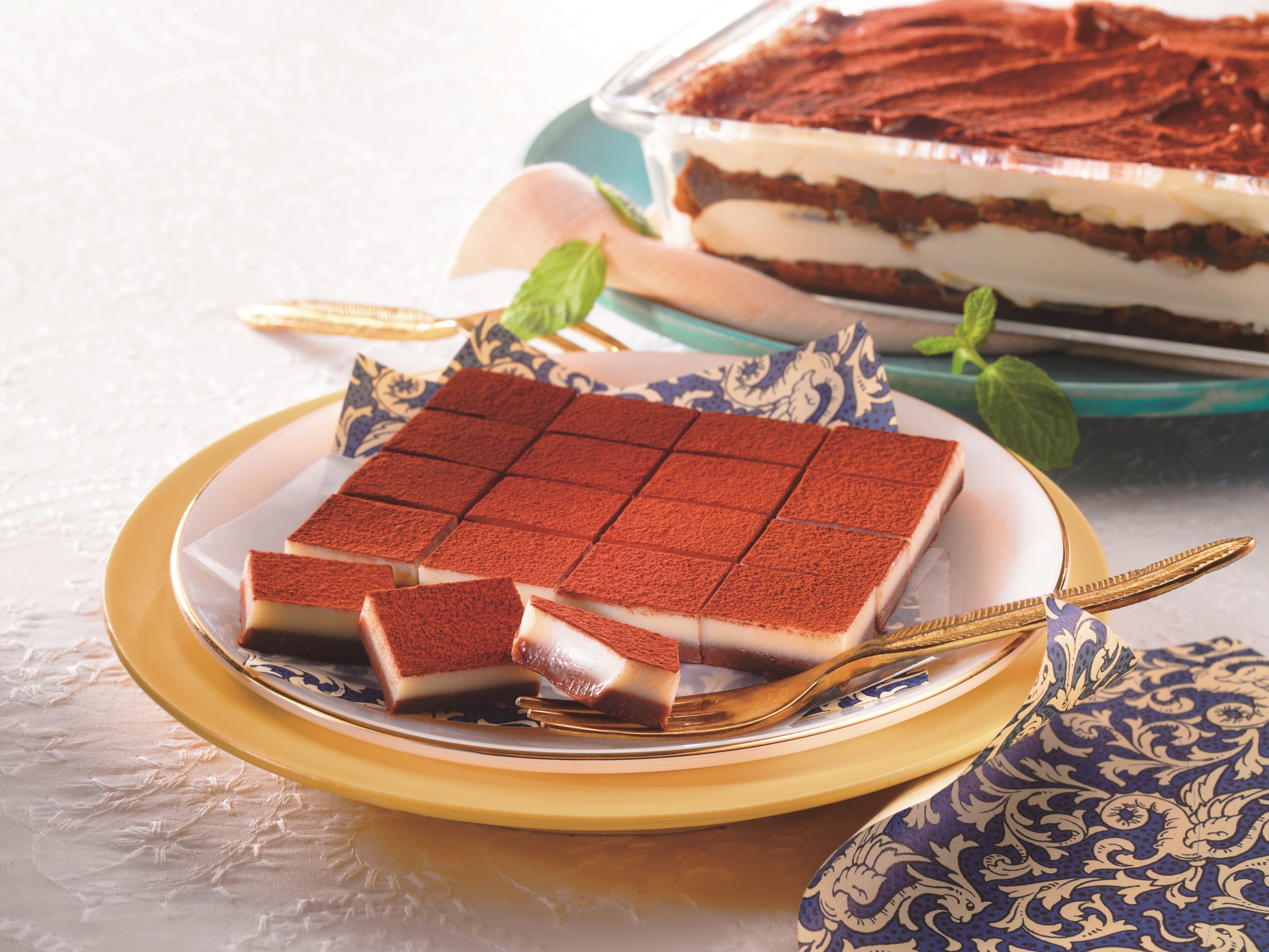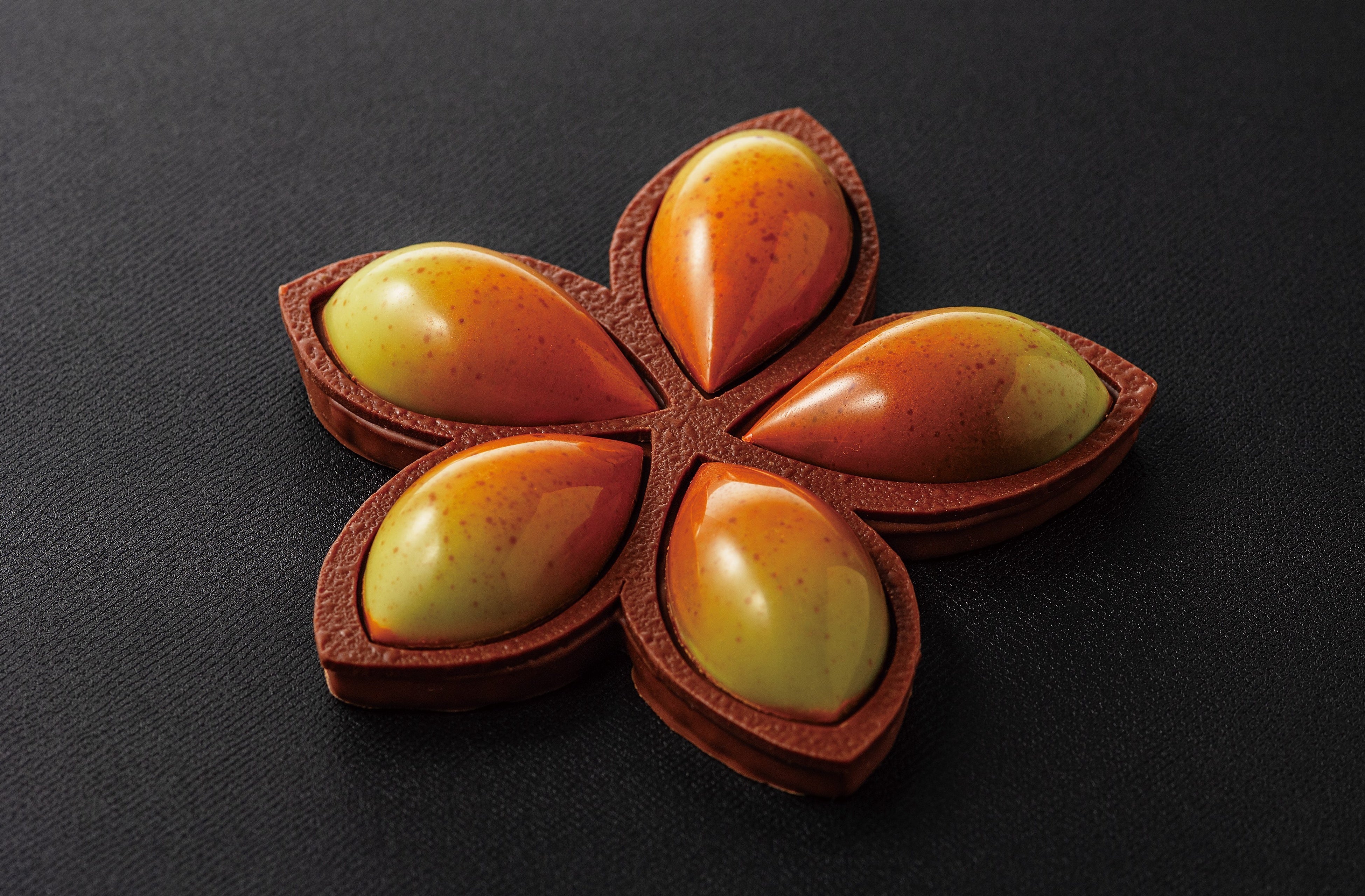 ココナッツとアーモンドのプラリネの上にパッションフルーツとマンゴーのキャラメルの二層。