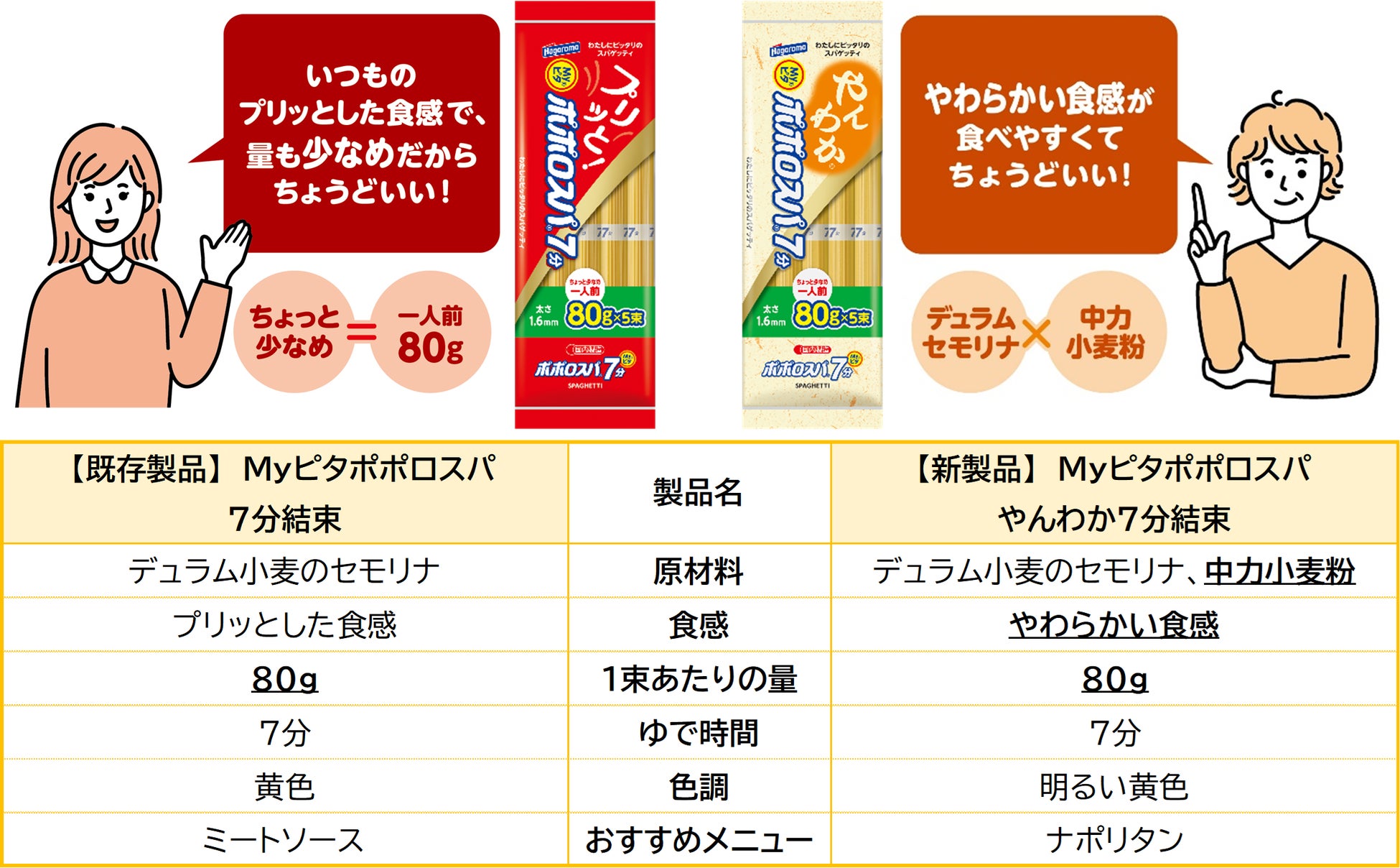 さらに今回の発売とあわせて、パッケージから食感の違いが一目で分かるように、既存製品「Myピタポポロスパ7分結束」にはデュラム小麦のセモリナ100%パスタの食感を表現した“プリッと”を、新製品「Myピタポポロスパやんわか7分」には“やんわか”を記載し、店舗の陳列により柔軟に対応できるように縦横兼用デザインとなっています。