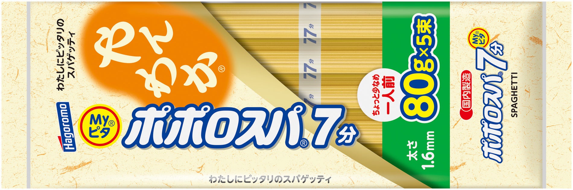 今回は、デュラム小麦のセモリナと中力粉を配合し、やわらかい食感に仕上げた「Myピタポポロスパやんわか7分結束」を発売します。ゆで時間は当社の「ポポロスパ」(デュラム小麦のセモリナ100%の通常のパスタ)と同じ7分で、ちょっと少なめに1人前80gに結束しています。