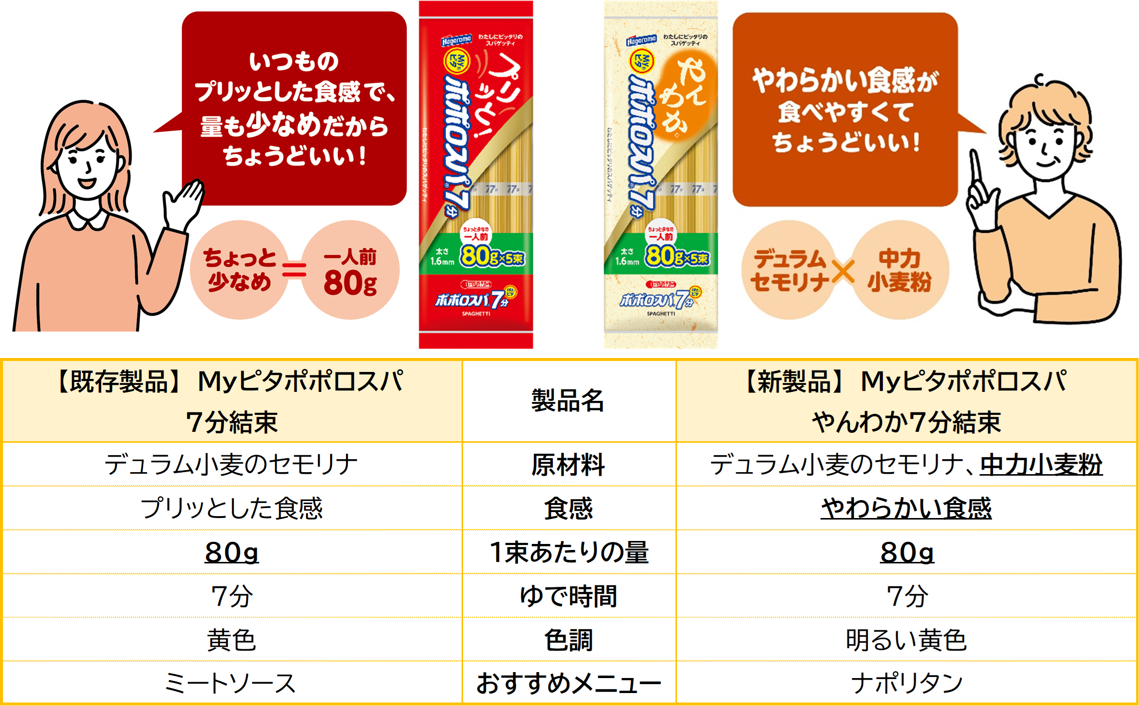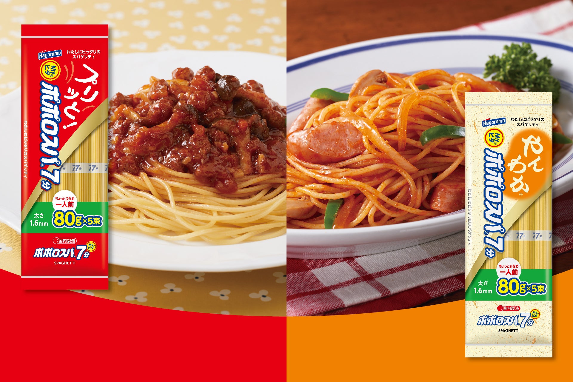 さらに今回の発売とあわせて、パッケージから食感の違いが一目で分かるように、既存製品「Myピタポポロスパ7分結束」にはデュラム小麦のセモリナ100%パスタの食感を表現した“プリッと”を、新製品「Myピタポポロスパやんわか7分」には“やんわか”を記載し、店舗の陳列により柔軟に対応できるように縦横兼用デザインとなっています。