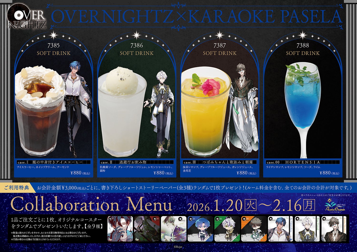 「OVERNIGHTZ」の3作発売を記念して、カラオケパセラにてコラボ開催が決定。メニューのご注文でオリジナルコースターを、さらにご利用金額に応じて書き下ろしショートストーリーペーパーをプレゼント。