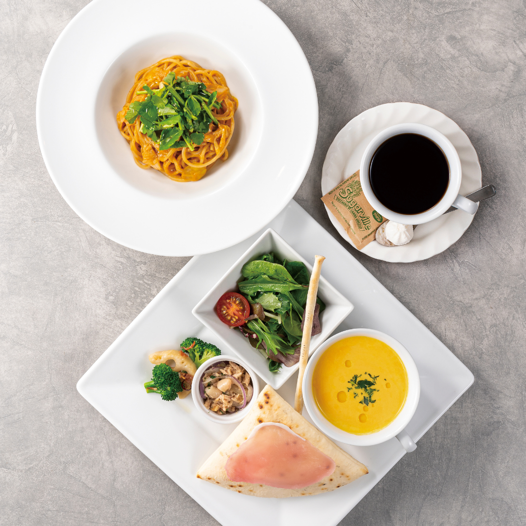 また、前菜からメインまで一度に少しずつ色々楽しみたい方のために、サラダ、前菜2種、スープ、窯焼きパンを盛り付けた前菜プレートと、ハーフサイズの「雲丹とセリのスパゲッティ」、そしてドリンクがセットになった「季節のピアットウニコ」としてもご用意しております。
