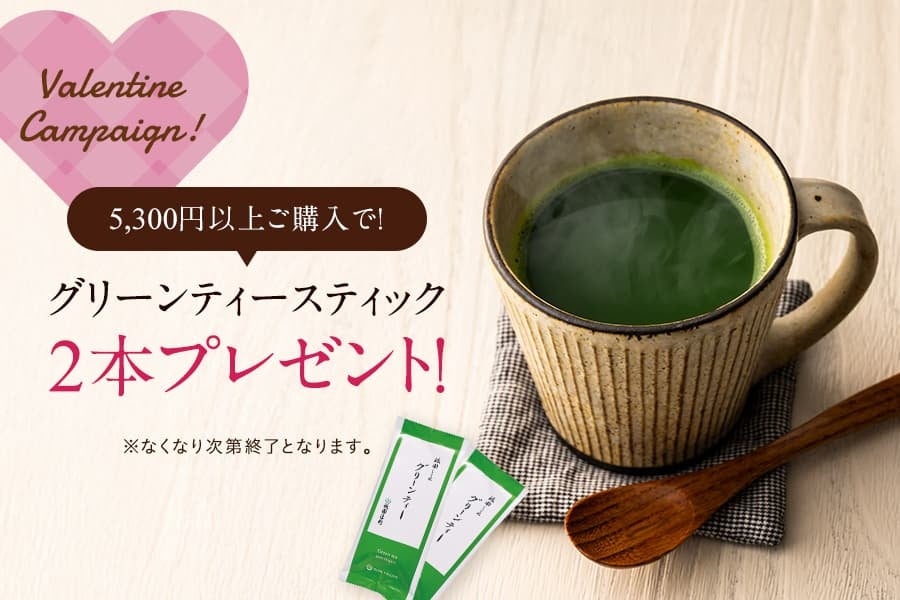 1月14日(水)から2月8日(日)までの期間に、チョコレートを含む5,300円以上ご購入いただいた方には、バレンタイン仕様の「グリーンティー 20g × 2袋」をプレゼントいたします。(※無くなり次第終了)