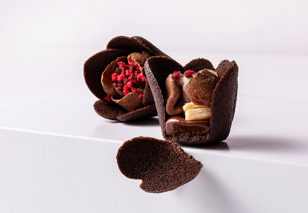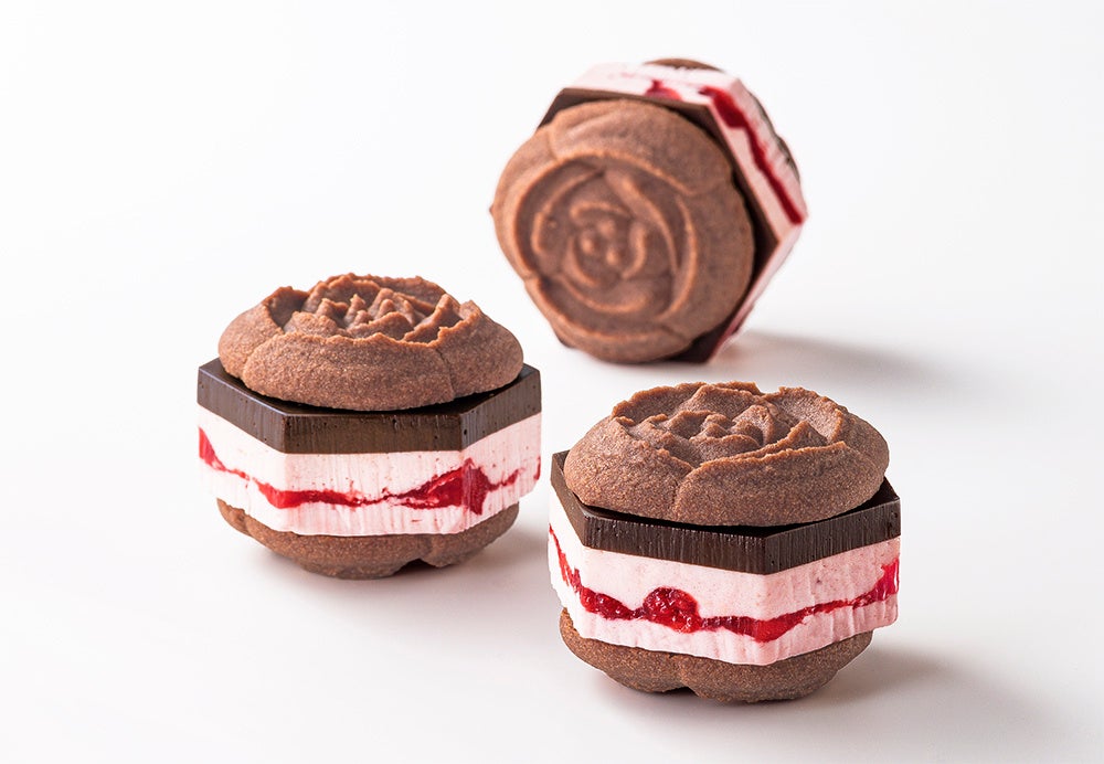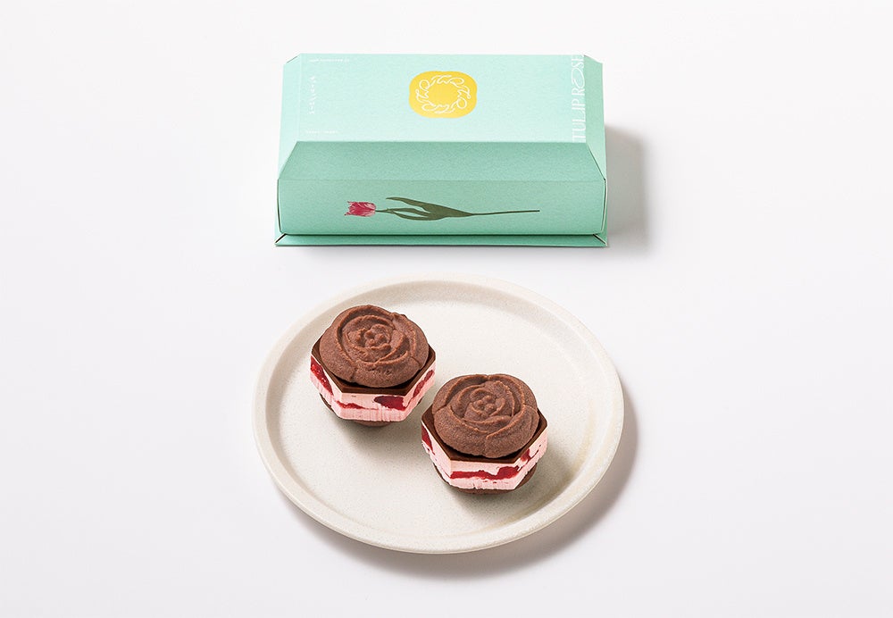 チューリップの花びらのように繊細で軽やかに焼き上げたラングドシャクッキーは、よく見るとハートの花びらを秘めた特別バージョン。香ばしいココアラングドシャと3種の魅力の生食感ショコラバタークリームの本格感のある味わいに、ハートの花びらを添えてバレンタインらしい“ときめき”を加えました。