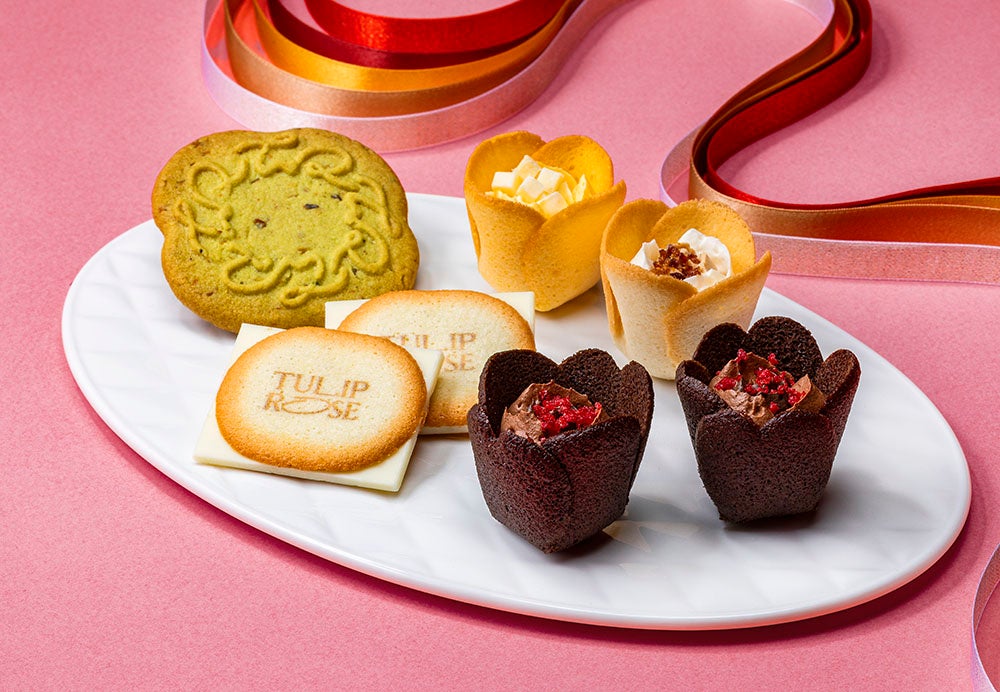 花の喜びを贈る、花束のような詰合せ。代表作チューリップローズから「バター」「チーズ」&バレンタインシーズン限定「ショコラ・フルコース」。チーズショコラサンドとピスタチオバターサブレも。5種の美味しさ溢れるセットです。