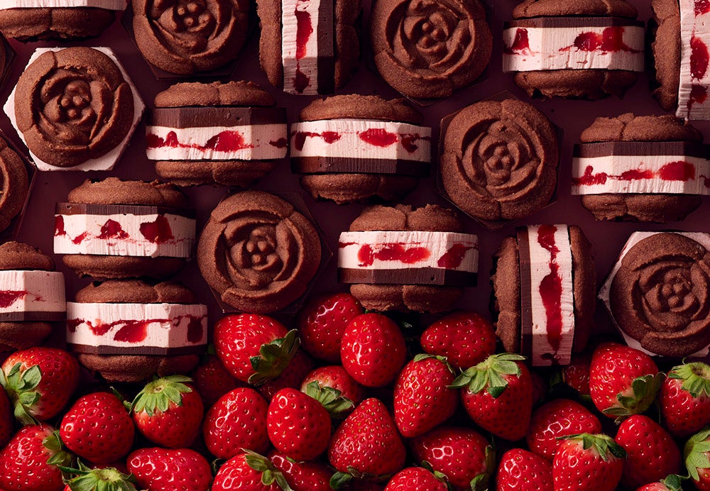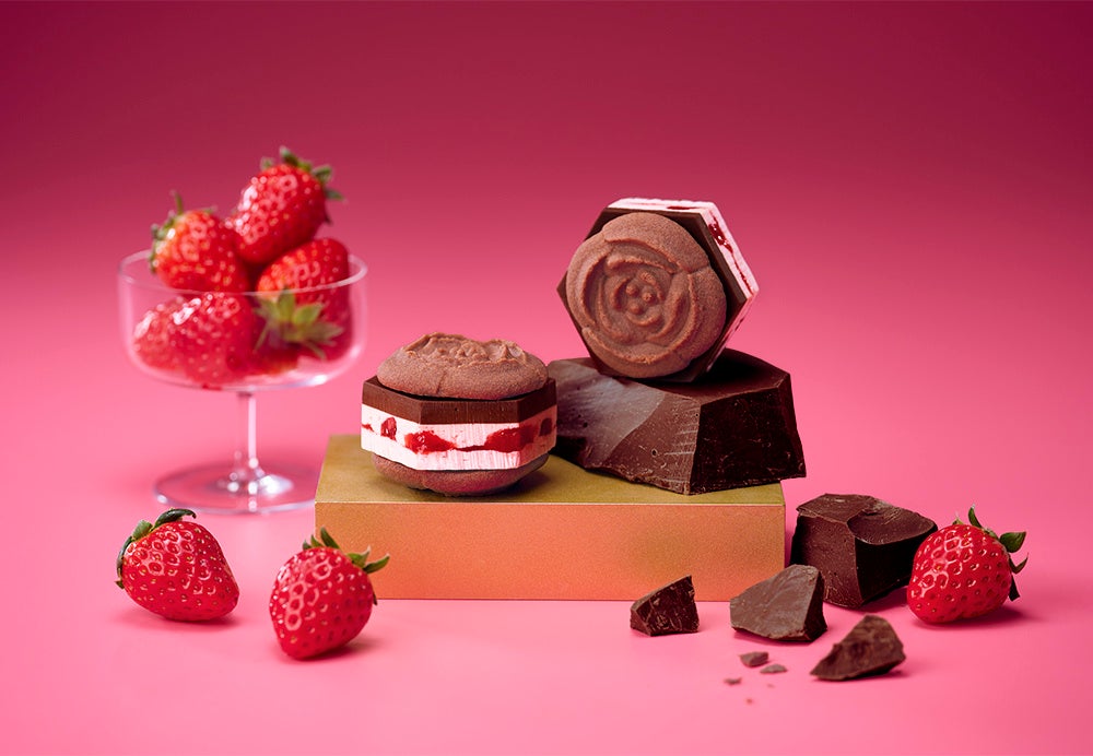 チューリップの花びらのように繊細で軽やかに焼き上げたラングドシャクッキーは、よく見るとハートの花びらを秘めた特別バージョン。香ばしいココアラングドシャと3種の魅力の生食感ショコラバタークリームの本格感のある味わいに、ハートの花びらを添えてバレンタインらしい“ときめき”を加えました。