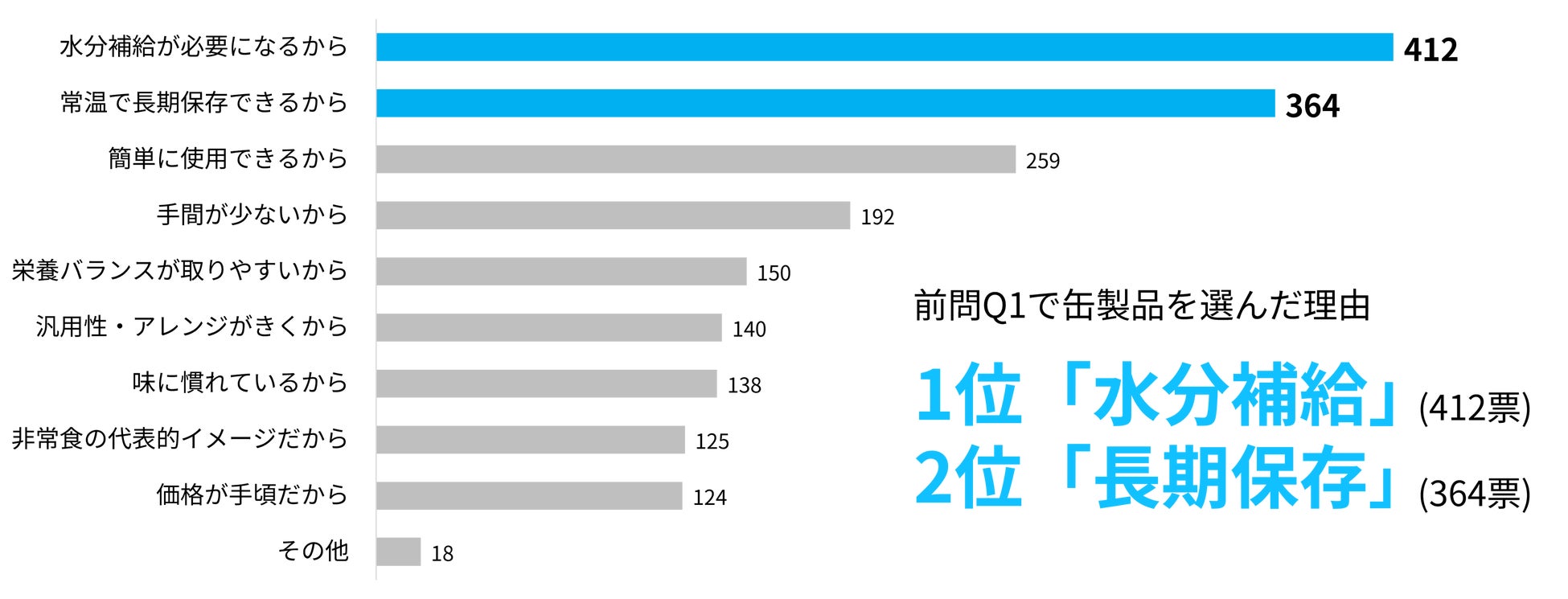 前問①で缶詰製品を選んだ理由を聞いたところ、「水分補給が必要になるから(412票)」が最も多く、災害時の水不足を意識していることがわかりました。次いで「常温で長期保存できるから(364票)」が2番目に多い理由として挙げられており、防災グッズの保管や準備を手軽にできるよう長期保存が可能な缶製品が選ばれているようです。