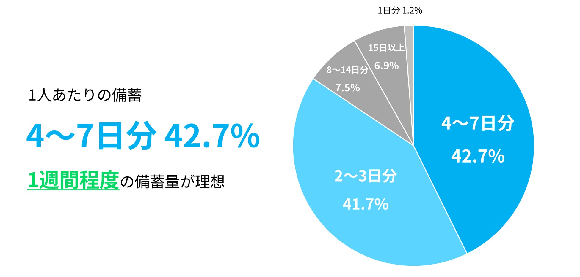 常備する備蓄品の目安として1人あたり何日分を備えたいか尋ねたところ、「4~7日分」と答えた人が42.7%で最も多く、1週間分程度の備蓄が理想とされています。災害時の復旧期間を見据えた計画的な備蓄が重視されていることがわかります。