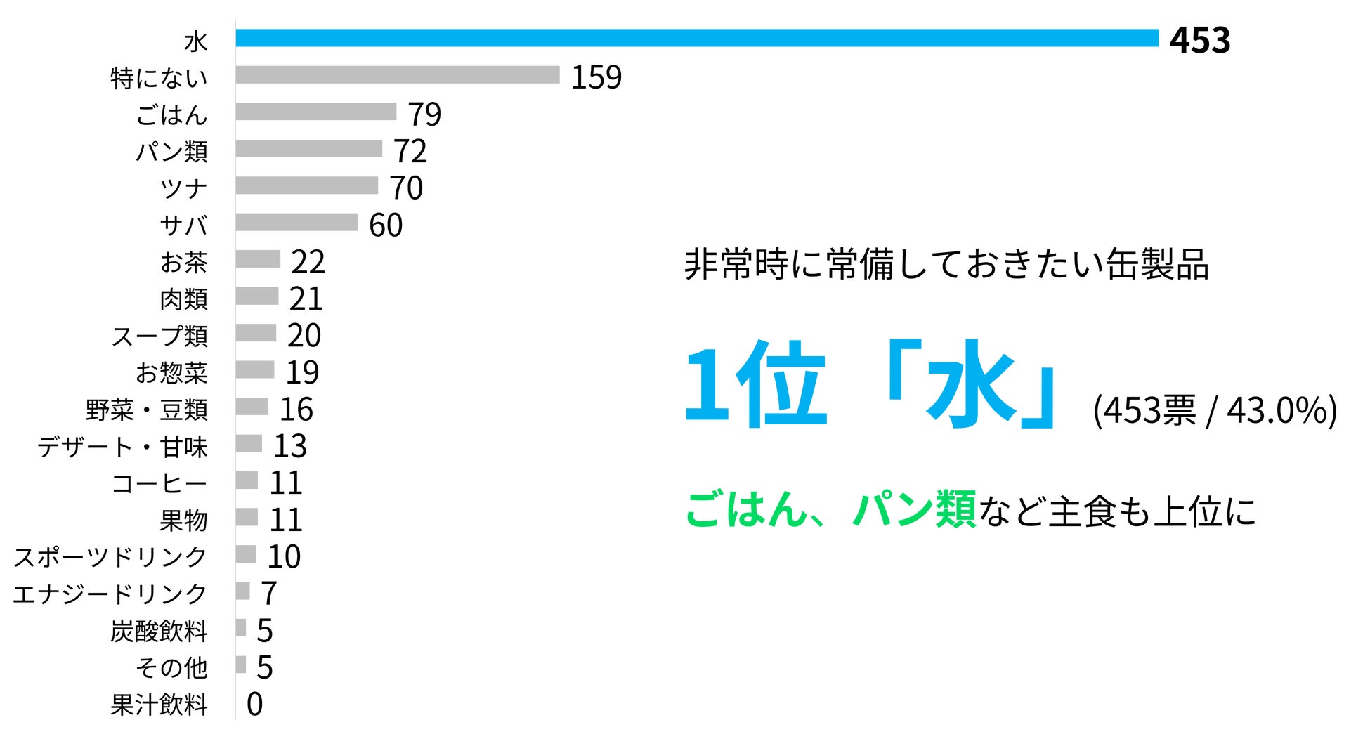 非常時に最も常備したい缶製品を聞いたところ、「水」と答えた人が全体の約半数の453票で1位となりました。その他「ご飯」や「パン類」など主食も上位に挙げられており、災害時の水不足や食料不足を考慮した缶詰製品が選ばれているようです。