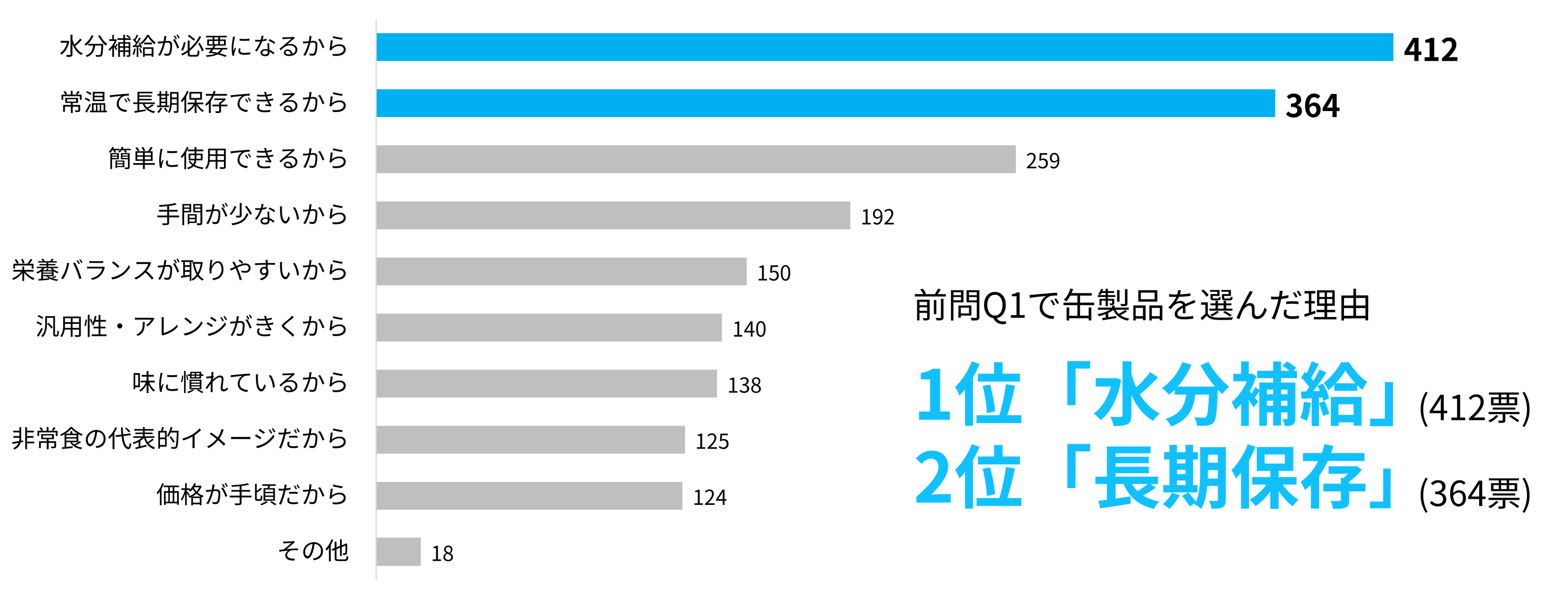 前問①で缶詰製品を選んだ理由を聞いたところ、「水分補給が必要になるから(412票)」が最も多く、災害時の水不足を意識していることがわかりました。次いで「常温で長期保存できるから(364票)」が2番目に多い理由として挙げられており、防災グッズの保管や準備を手軽にできるよう長期保存が可能な缶製品が選ばれているようです。