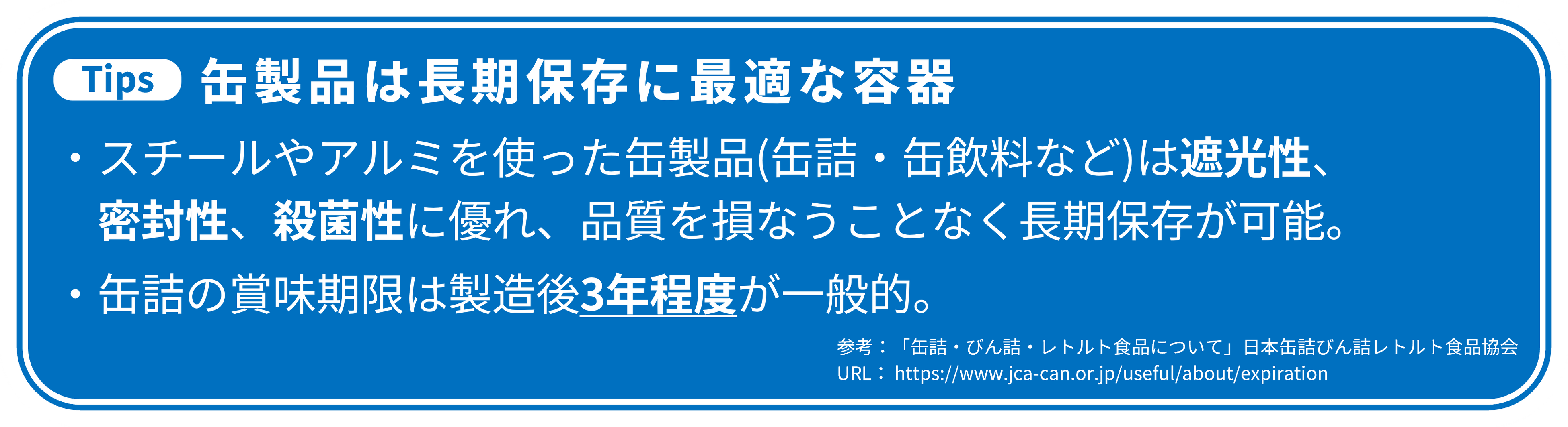 非常時の食・飲料で最も重視する点を尋ねたところ、「保存期限」が最も重視されていることがわかりました。缶製品はスチールやアルミの特長である高い密封性と遮光性によって長期保存が可能であり、非常用缶詰など非常時の備蓄品として多く採用されています。