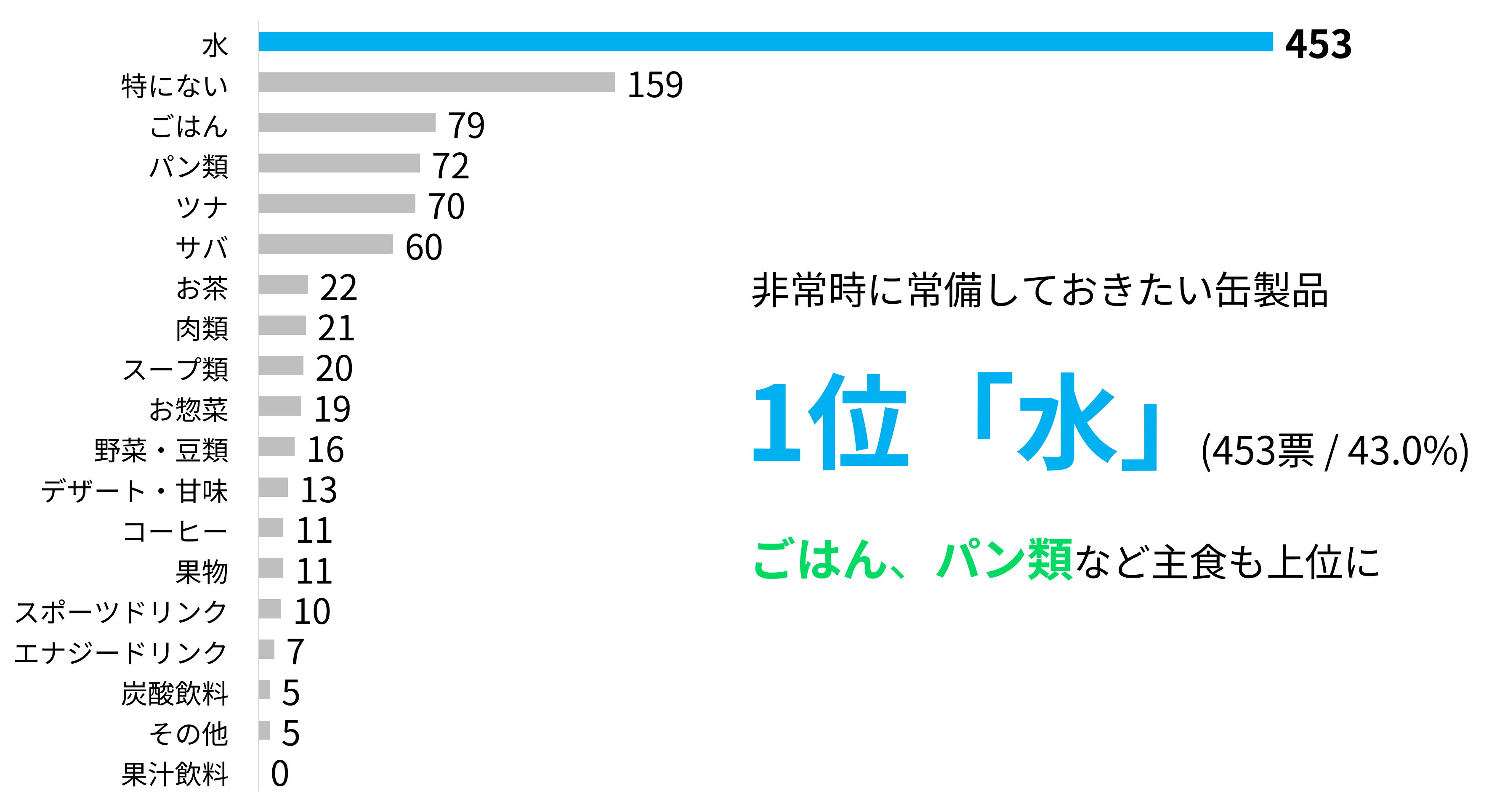 非常時に最も常備したい缶製品を聞いたところ、「水」と答えた人が全体の約半数の453票で1位となりました。その他「ご飯」や「パン類」など主食も上位に挙げられており、災害時の水不足や食料不足を考慮した缶詰製品が選ばれているようです。