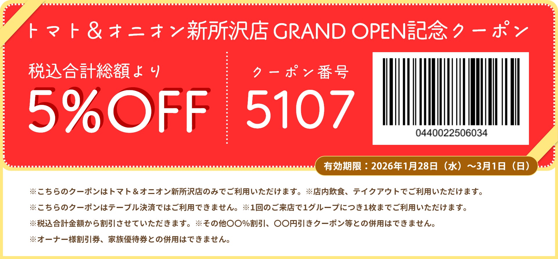 株式会社トマトアンドアソシエイツ(本社:兵庫県西宮市、代表取締役社長:笹村 啓介)が運営する、アメリカンダイニングレストラン「トマト&オニオン」は、2026年1月28日(水)に「トマト&オニオン 新所沢店」をオープンいたします。