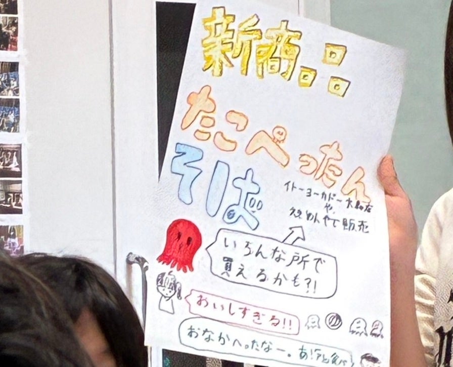 「たこぺったんそば」の販促物について、子どもたちからのブラッシュアップ提案を反映し、キャッチコピーやポスターイメージをより具体的化。