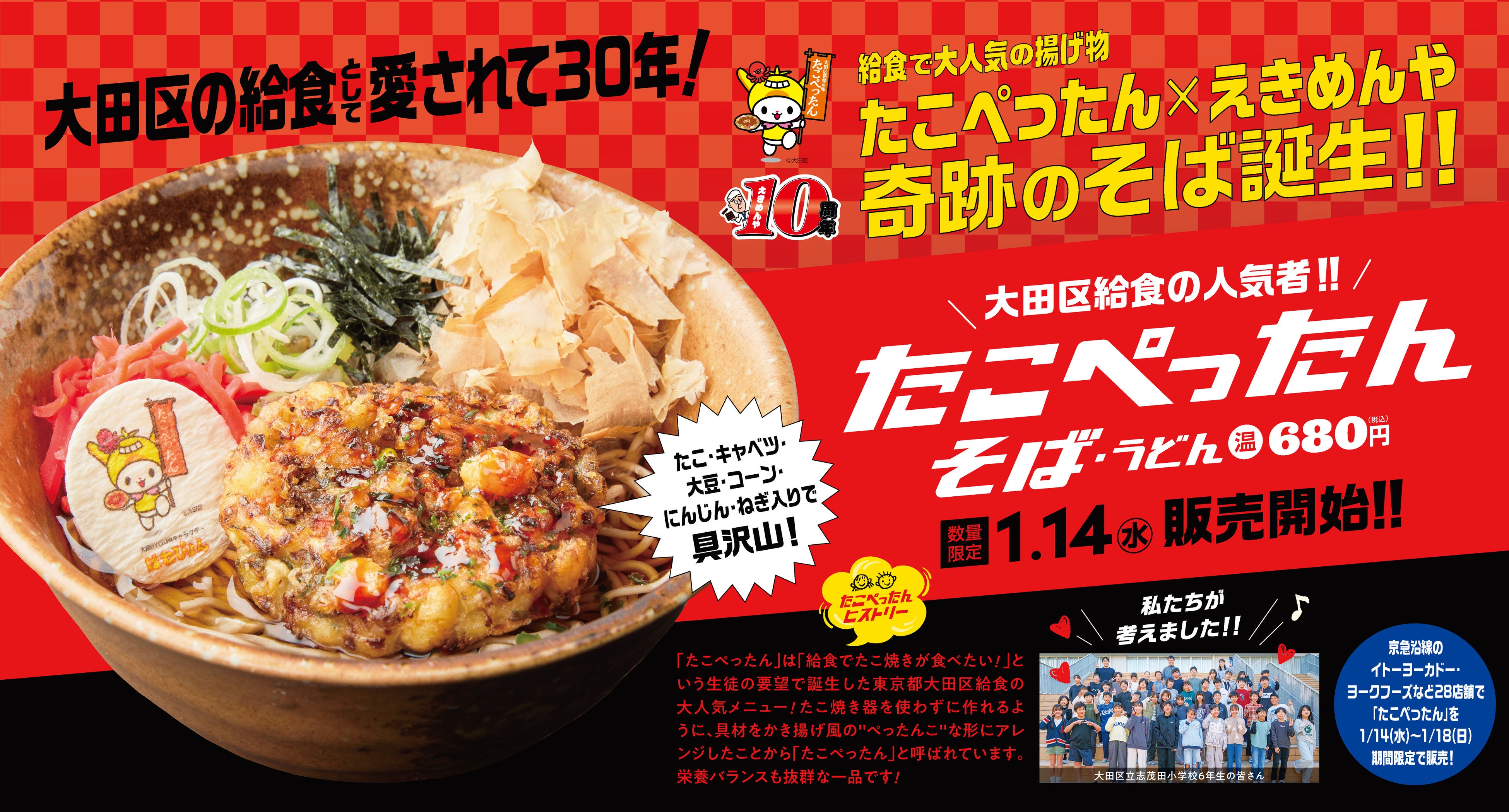 京急開発株式会社(本社:大田区平和島、取締役社長:渡辺静義、以下京急開発)と京急開発グループで飲食事業を担う京急ロイヤルフーズ株式会社(本社:大田区平和島 取締役社長:小島賢二、以下京急ロイヤルフーズ)は、大田区発祥の給食メニュー「たこぺったん」とコラボレーションした新商品「たこぺったんそば(うどん)」を、2026年1月14日(水)から数量限定で、京急沿線の駅そば店舗「えきめんや」および「麵丼屋」(BIGFUN平和島内)にて販売いたします。
